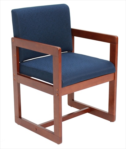 Sled base side chair with arms includes solid wood veneer frame with Cherry finish. Thick waterfall cushions are wrapped in a Blue Zenith designer fabric that is sure to accent any library reception or conference setting. Features