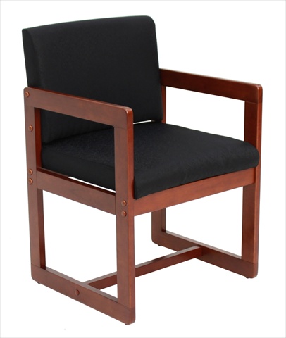 Sled base side chair with arms includes solid wood veneer frame with Cherry finish. Thick waterfall cushions are wrapped in a Black Zenith designer fabric that is sure to accent any library reception or conference setting. Features