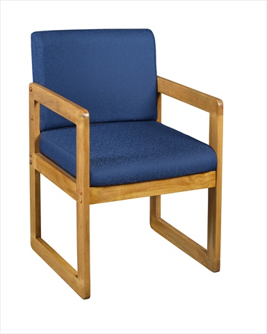 Sled base side chair with arms includes solid wood veneer frame with Medium Oak finish. Thick waterfall cushions are wrapped in a Blue Zenith designer fabric that is sure to accent any library reception or conference setting. Features