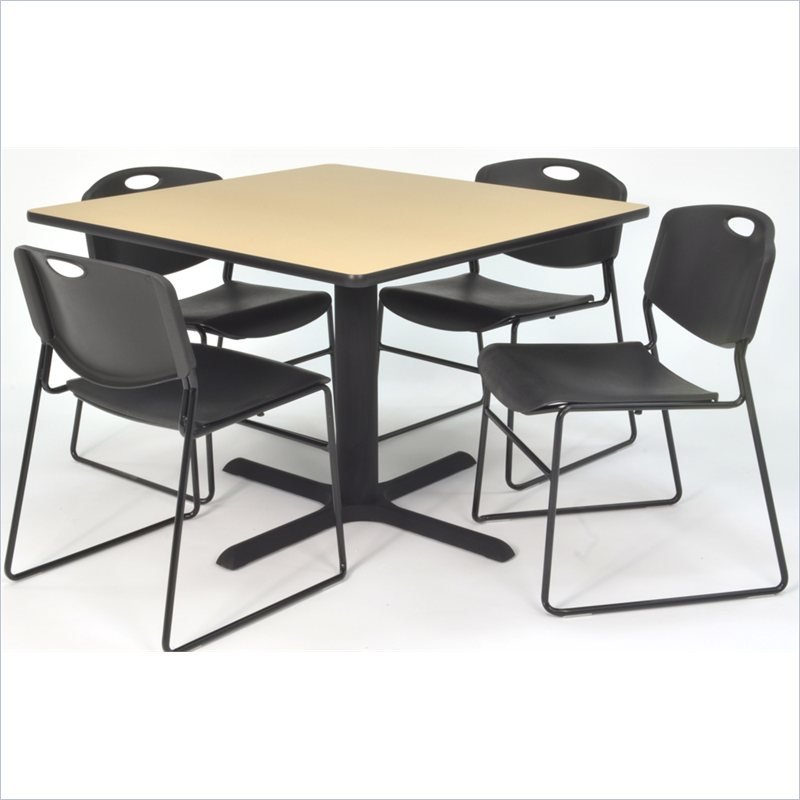 | Regency - Lunchroom Tables - TB3636BE44BK - Whether you're planning a lounge, café, library, breakroom or restaurant, let the Cain Collection take you there. These versatile tables are at home in stylish café or coffee shop settings as well as lunch rooms. This set includes one 36-inch square Cain table and four Black Zeng Stack Chairs. The table is constructed of a thermal fused melamine Beige laminate tabletop that is 1-inch thick and finished with a black T-Mold edge band. Rounded corners make the table safer for everyone. Laminates are scratch, stain and burn resistant and wipe clean easily. The stylish X-Base is constructed of a tubular steel post and solid steel X-Base. Hidden adjustable glides keep the tabletop level and are easy to adjust. Regency's Patent-Pending Zeng stack chair is not only unique, but durable, sturdy and versatile as well. The Zeng seat and back are treated with an anti-microbial agent, which makes it perfect for schools, waiting rooms, cafeterias and more. A reinforced black metal frame is designed to support up to 400lbs and a built in handle makes moving the chair easier. All Regency chairs are backed by a 5-year limited manufacturer's warranty on chair bases and frames and a 2-year limited manufacturer's warranty on chair mechanisms and upholstery. Cain tables are backed by a 10-Year Limited Manufacturer's Warranty. Finish: Beige/ BlackMaterial: Laminate/ Metal/ PolypropyleneVersatile table & chair set includes one 36-inch square Cain table and 4 Black Zeng Stack ChairsTabletop is constructed of a 1-inch thick thermal fused melamine laminate finished with a black T-Mold edge bandingBeige laminate tabletop is scratch, stain and burn resistant and wipes clean easilyTreated with an anti-microbial agent, which makes it perfect for schools, cafeterias or waiting roomsChairs have a reinforced black metal frame designed to withstand 400-poundsBuilt-in carrying handle that makes moving easySpecifications:Overall Product Dimensions: 29 H x