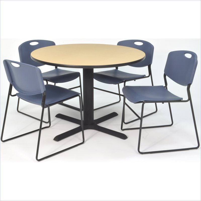 | Regency - Lunchroom Tables - TB36RNDBE44BE - Whether you're planning a lounge, café, library, breakroom or restaurant, let the Cain Collection take you there. These versatile tables are at home in stylish café or coffee shop settings as well as lunch rooms. This set includes one 36-inch round Cain table and four Blue Zeng Stack Chairs. The table is constructed of a thermal fused melamine Beige laminate tabletop that is 1-inch thick and finished with a black T-Mold edge band. Laminates are scratch, stain and burn resistant and wipe clean easily. The stylish X-Base is constructed of a tubular steel post and solid steel X-Base. Hidden adjustable glides keep the tabletop level and are easy to adjust. Regency's Patent-Pending Zeng stack chair is not only unique, but durable, sturdy and versatile as well. The Zeng seat and back are treated with an anti-microbial agent, which makes it perfect for schools, waiting rooms, cafeterias and more. A reinforced black metal frame is designed to support up to 400lbs and a built in handle makes moving the chair easier. All Regency chairs are backed by a 5-year limited manufacturer's warranty on chair bases and frames and a 2-year limited manufacturer's warranty on chair mechanisms and upholstery. Cain tables are backed by a 10-Year Limited Manufacturer's Warranty. Finish: Beige/ BlueMaterial: Laminate/ Metal/ PolypropyleneVersatile table & chair set includes one 36-inch round Cain table and 4 Blue Zeng Stack ChairsTabletop is constructed of a 1-inch thick thermal fused melamine laminate finished with a black T-Mold edge bandingBeige laminate tabletop is scratch, stain and burn resistant and wipes clean easilyTreated with an anti-microbial agent, which makes it perfect for schools, cafeterias or waiting roomsChairs have a reinforced black metal frame designed to withstand 400-poundsBuilt-in carrying handle that makes moving easySpecifications:Overall Product Dimensions: 29 H x 36 W x 36 DProduct Weight: 91 lbsChair Dimensions: