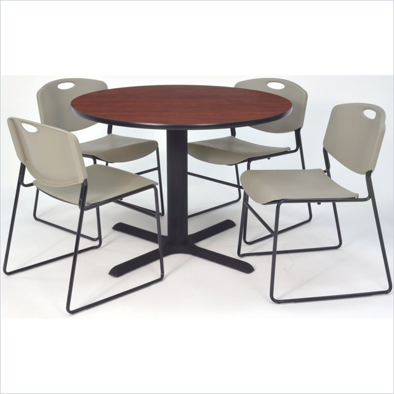 | Regency - Lunchroom Tables - TB36RNDCH44GY - Whether you're planning a lounge, café, library, breakroom or restaurant, let the Cain Collection take you there. These versatile tables are at home in stylish café or coffee shop settings as well as lunch rooms. This set includes one 36-inch round Cain table and four Gray Zeng Stack Chairs. The table is constructed of a thermal fused melamine Cherry laminate tabletop that is 1-inch thick and finished with a black T-Mold edge band. Laminates are scratch, stain and burn resistant and wipe clean easily. The stylish X-Base is constructed of a tubular steel post and solid steel X-Base. Hidden adjustable glides keep the tabletop level and are easy to adjust. Regency's Patent-Pending Zeng stack chair is not only unique, but durable, sturdy and versatile as well. The Zeng seat and back are treated with an anti-microbial agent, which makes it perfect for schools, waiting rooms, cafeterias and more. A reinforced black metal frame is designed to support up to 400lbs and a built in handle makes moving the chair easier. All Regency chairs are backed by a 5-year limited manufacturer's warranty on chair bases and frames and a 2-year limited manufacturer's warranty on chair mechanisms and upholstery. Cain tables are backed by a 10-Year Limited Manufacturer's Warranty. Finish: Cherry/ GrayMaterial: Laminate/ Metal/ PolypropyleneVersatile table & chair set includes one 36-inch round Cain table and 4 Gray Zeng Stack ChairsTabletop is constructed of a 1-inch thick thermal fused melamine laminate finished with a black T-Mold edge bandingCherry laminate tabletop is scratch, stain and burn resistant and wipes clean easilyTreated with an anti-microbial agent, which makes it perfect for schools, cafeterias or waiting roomsChairs have a reinforced black metal frame designed to withstand 400-poundsBuilt-in carrying handle that makes moving easySpecifications:Overall Product Dimensions: 29 H x 36 W x 36 DProduct Weight: 91 lbsChair Dimension