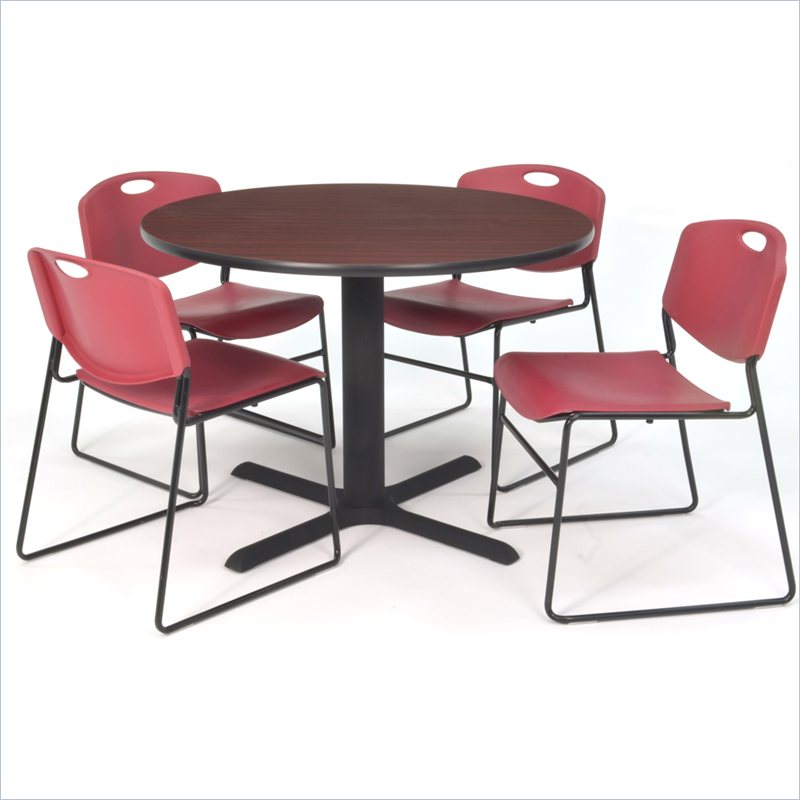 | Regency - Lunchroom Tables - TB36RNDMH44BY - Whether you're planning a lounge, café, library, breakroom or restaurant, let the Cain Collection take you there. These versatile tables are at home in stylish café or coffee shop settings as well as lunch rooms. This set includes one 36-inch round Cain table and four Burgundy Zeng Stack Chairs. The table is constructed of a thermal fused melamine Mahogany laminate tabletop that is 1-inch thick and finished with a black T-Mold edge band. Laminates are scratch, stain and burn resistant and wipe clean easily. The stylish X-Base is constructed of a tubular steel post and solid steel X-Base. Hidden adjustable glides keep the tabletop level and are easy to adjust. Regency's Patent-Pending Zeng stack chair is not only unique, but durable, sturdy and versatile as well. The Zeng seat and back are treated with an anti-microbial agent, which makes it perfect for schools, waiting rooms, cafeterias and more. A reinforced black metal frame is designed to support up to 400lbs and a built in handle makes moving the chair easier. All Regency chairs are backed by a 5-year limited manufacturer's warranty on chair bases and frames and a 2-year limited manufacturer's warranty on chair mechanisms and upholstery. Cain tables are backed by a 10-Year Limited Manufacturer's Warranty. Finish: Mahogany/ BurgundyMaterial: Laminate/ Metal/ PolypropyleneVersatile table & chair set includes one 36-inch round Cain table and 4 Burgundy Zeng Stack ChairsTabletop is constructed of a 1-inch thick thermal fused melamine laminate finished with a black T-Mold edge bandingMahogany laminate tabletop is scratch, stain and burn resistant and wipes clean easilyTreated with an anti-microbial agent, which makes it perfect for schools, cafeterias or waiting roomsChairs have a reinforced black metal frame designed to withstand 400-poundsBuilt-in carrying handle that makes moving easySpecifications:Overall Product Dimensions: 29 H x 36 W x 36 DProduct Weight: 91
