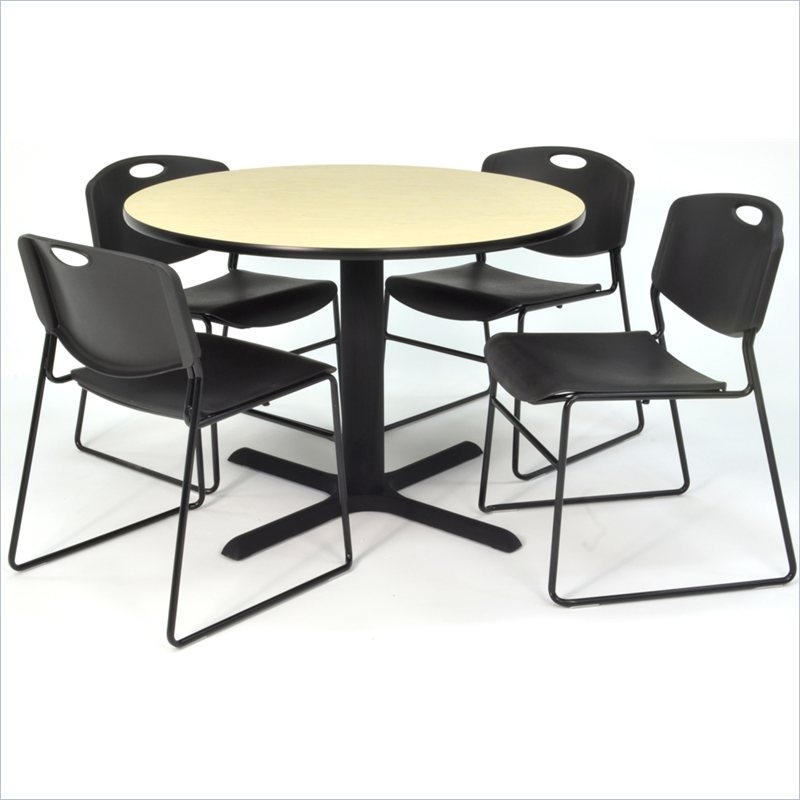 | Regency - Lunchroom Tables - TB36RNDPL44BK - Whether you're planning a lounge, café, library, breakroom or restaurant, let the Cain Collection take you there. These versatile tables are at home in stylish café or coffee shop settings as well as lunch rooms. This set includes one 36-inch round Cain table and four Black Zeng Stack Chairs. The table is constructed of a thermal fused melamine Maple laminate tabletop that is 1-inch thick and finished with a black T-Mold edge band. Laminates are scratch, stain and burn resistant and wipe clean easily. The stylish X-Base is constructed of a tubular steel post and solid steel X-Base. Hidden adjustable glides keep the tabletop level and are easy to adjust. Regency's Patent-Pending Zeng stack chair is not only unique, but durable, sturdy and versatile as well. The Zeng seat and back are treated with an anti-microbial agent, which makes it perfect for schools, waiting rooms, cafeterias and more. A reinforced black metal frame is designed to support up to 400lbs and a built in handle makes moving the chair easier. All Regency chairs are backed by a 5-year limited manufacturer's warranty on chair bases and frames and a 2-year limited manufacturer's warranty on chair mechanisms and upholstery. Cain tables are backed by a 10-Year Limited Manufacturer's Warranty. Finish: Maple/ BlackMaterial: Laminate/ Metal/ PolypropyleneVersatile table & chair set includes one 36-inch round Cain table and 4 Black Zeng Stack ChairsTabletop is constructed of a 1-inch thick thermal fused melamine laminate finished with a black T-Mold edge bandingMaple laminate tabletop is scratch, stain and burn resistant and wipes clean easilyTreated with an anti-microbial agent, which makes it perfect for schools, cafeterias or waiting roomsChairs have a reinforced black metal frame designed to withstand 400-poundsBuilt-in carrying handle that makes moving easySpecifications:Overall Product Dimensions: 29 H x 36 W x 36 DProduct Weight: 91 lbsChair Dimension