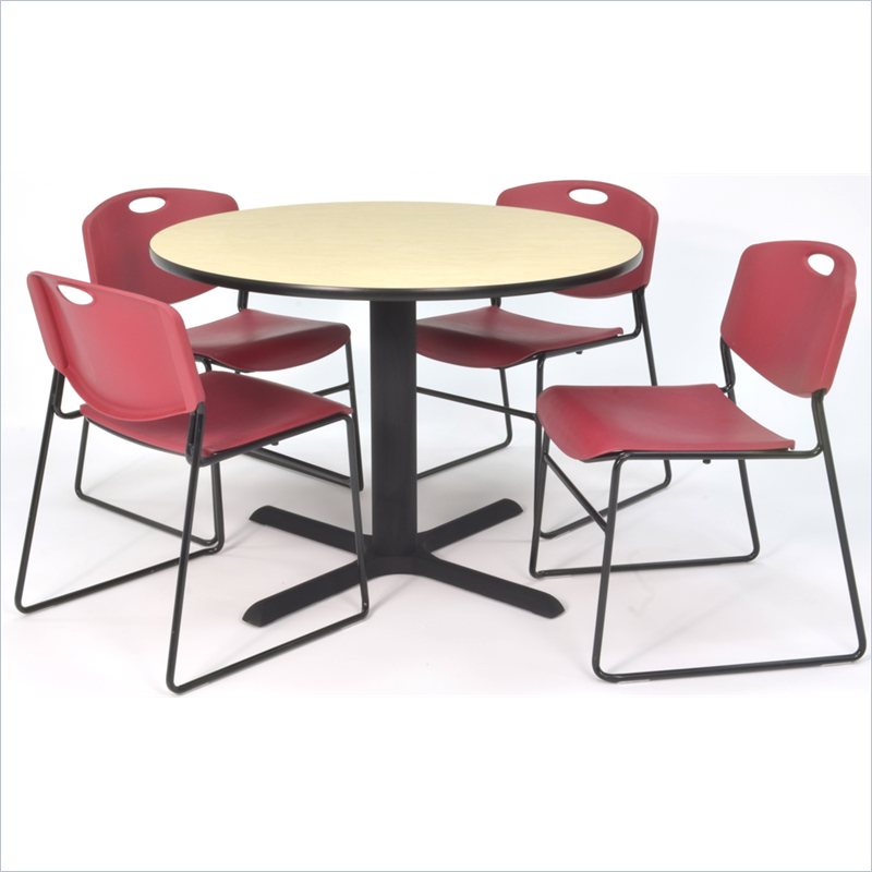 | Regency - Lunchroom Tables - TB36RNDPL44BY - Whether you're planning a lounge, café, library, breakroom or restaurant, let the Cain Collection take you there. These versatile tables are at home in stylish café or coffee shop settings as well as lunch rooms. This set includes one 36-inch round Cain table and four Burgundy Zeng Stack Chairs. The table is constructed of a thermal fused melamine Maple laminate tabletop that is 1-inch thick and finished with a black T-Mold edge band. Laminates are scratch, stain and burn resistant and wipe clean easily. The stylish X-Base is constructed of a tubular steel post and solid steel X-Base. Hidden adjustable glides keep the tabletop level and are easy to adjust. Regency's Patent-Pending Zeng stack chair is not only unique, but durable, sturdy and versatile as well. The Zeng seat and back are treated with an anti-microbial agent, which makes it perfect for schools, waiting rooms, cafeterias and more. A reinforced black metal frame is designed to support up to 400lbs and a built in handle makes moving the chair easier. All Regency chairs are backed by a 5-year limited manufacturer's warranty on chair bases and frames and a 2-year limited manufacturer's warranty on chair mechanisms and upholstery. Cain tables are backed by a 10-Year Limited Manufacturer's Warranty. Finish: Maple/ BurgundyMaterial: Laminate/ Metal/ PolypropyleneVersatile table & chair set includes one 36-inch round Cain table and 4 Burgundy Zeng Stack ChairsTabletop is constructed of a 1-inch thick thermal fused melamine laminate finished with a black T-Mold edge bandingMaple laminate tabletop is scratch, stain and burn resistant and wipes clean easilyTreated with an anti-microbial agent, which makes it perfect for schools, cafeterias or waiting roomsChairs have a reinforced black metal frame designed to withstand 400-poundsBuilt-in carrying handle that makes moving easySpecifications:Overall Product Dimensions: 29 H x 36 W x 36 DProduct Weight: 91 lbsChair