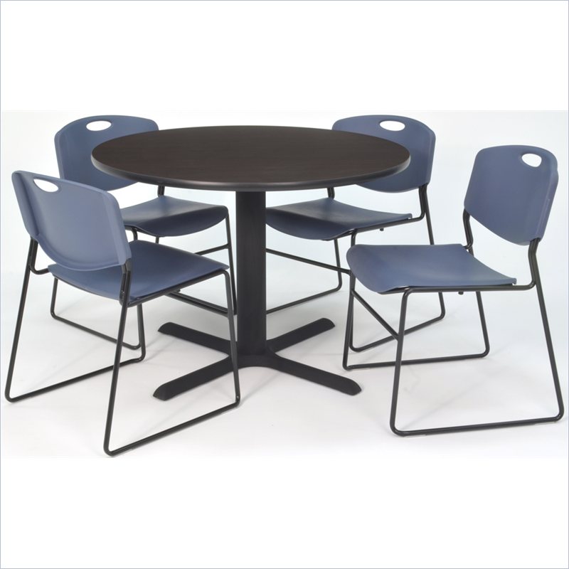 | Regency - Lunchroom Tables - TB36RNDMW44BE - Whether you're planning a lounge, café, library, breakroom or restaurant, let the Cain Collection take you there. These versatile tables are at home in stylish café or coffee shop settings as well as lunch rooms. This set includes one 36-inch round Cain table and four Blue Zeng Stack Chairs. The table is constructed of a thermal fused melamine Mocha Walnut laminate tabletop that is 1-inch thick and finished with a black T-Mold edge band. Laminates are scratch, stain and burn resistant and wipe clean easily. The stylish X-Base is constructed of a tubular steel post and solid steel X-Base. Hidden adjustable glides keep the tabletop level and are easy to adjust. Regency's Patent-Pending Zeng stack chair is not only unique, but durable, sturdy and versatile as well. The Zeng seat and back are treated with an anti-microbial agent, which makes it perfect for schools, waiting rooms, cafeterias and more. A reinforced black metal frame is designed to support up to 400lbs and a built in handle makes moving the chair easier. All Regency chairs are backed by a 5-year limited manufacturer's warranty on chair bases and frames and a 2-year limited manufacturer's warranty on chair mechanisms and upholstery. Cain tables are backed by a 10-Year Limited Manufacturer's Warranty. Finish: Mocha Walnut/ BlueMaterial: Laminate/ Metal/ PolypropyleneVersatile table & chair set includes one 36-inch round Cain table and 4 Blue Zeng Stack ChairsTabletop is constructed of a 1-inch thick thermal fused melamine laminate finished with a black T-Mold edge bandingMocha Walnut laminate tabletop is scratch, stain and burn resistant and wipes clean easilyTreated with an anti-microbial agent, which makes it perfect for schools, cafeterias or waiting roomsChairs have a reinforced black metal frame designed to withstand 400-poundsBuilt-in carrying handle that makes moving easySpecifications:Overall Product Dimensions: 29 H x 36 W x 36 DProduct Weight: 91
