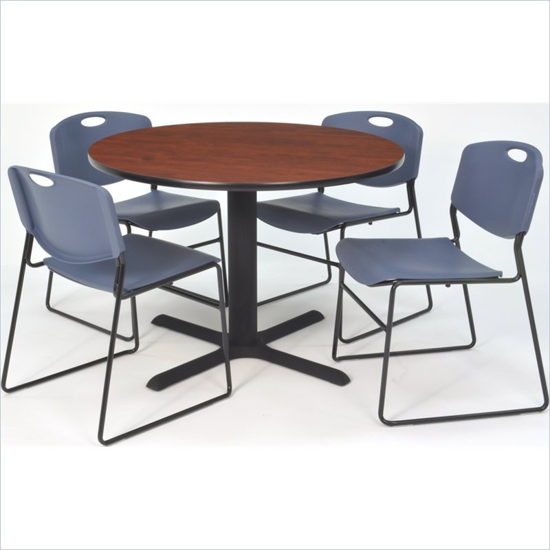 | Regency - Lunchroom Tables - TB4242CH44BE - Whether you're planning a lounge, café, library, breakroom or restaurant, let the Cain Collection take you there. These versatile tables are at home in stylish café or coffee shop settings as well as lunch rooms. This set includes one 42-inch square Cain table and four Blue Zeng Stack Chairs. The table is constructed of a thermal fused melamine Cherry laminate tabletop that is 1-inch thick and finished with a black T-Mold edge band. Rounded corners make the table safer for everyone. Laminates are scratch, stain and burn resistant and wipe clean easily. The stylish X-Base is constructed of a tubular steel post and solid steel X-Base. Hidden adjustable glides keep the tabletop level and are easy to adjust. Regency's Patent-Pending Zeng stack chair is not only unique, but durable, sturdy and versatile as well. The Zeng seat and back are treated with an anti-microbial agent, which makes it perfect for schools, waiting rooms, cafeterias and more. A reinforced black metal frame is designed to support up to 400lbs and a built in handle makes moving the chair easier. All Regency chairs are backed by a 5-year limited manufacturer's warranty on chair bases and frames and a 2-year limited manufacturer's warranty on chair mechanisms and upholstery. Cain tables are backed by a 10-Year Limited Manufacturer's Warranty. Finish: Cherry/ BlueMaterial: Laminate/ Metal/ PolypropyleneVersatile table & chair set includes one 42-inch square Cain table and 4 Blue Zeng Stack ChairsTabletop is constructed of a 1-inch thick thermal fused melamine laminate finished with a black T-Mold edge bandingCherry laminate tabletop is scratch, stain and burn resistant and wipes clean easilyTreated with an anti-microbial agent, which makes it perfect for schools, cafeterias or waiting roomsChairs have a reinforced black metal frame designed to withstand 400-poundsBuilt-in carrying handle that makes moving easySpecifications:Overall Product Dimensions: 29 H x