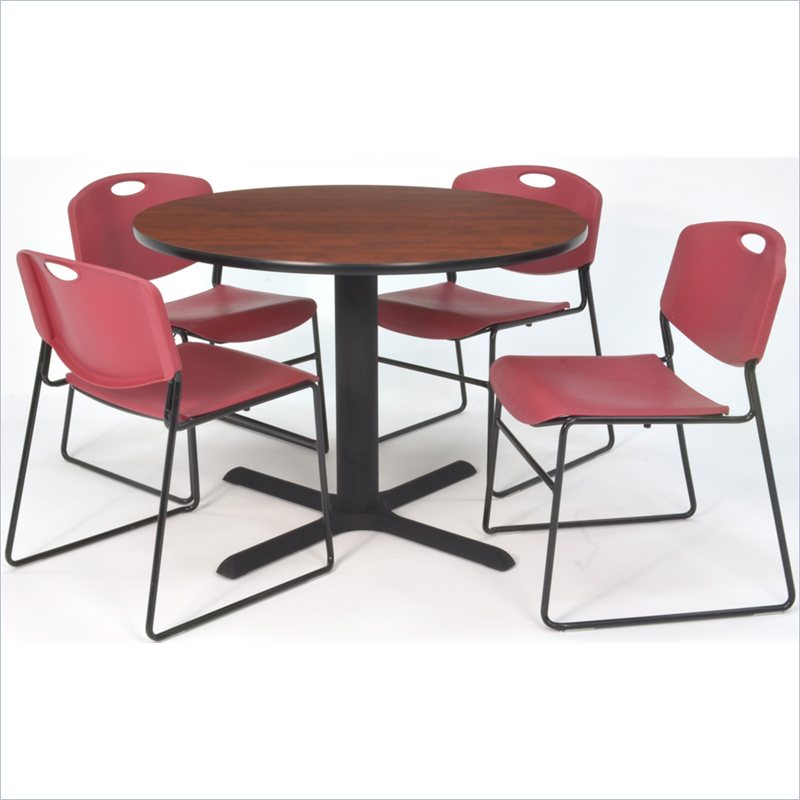 | Regency - Lunchroom Tables - TB4242CH44BY - Whether you're planning a lounge, café, library, breakroom or restaurant, let the Cain Collection take you there. These versatile tables are at home in stylish café or coffee shop settings as well as lunch rooms. This set includes one 42-inch square Cain table and four Burgundy Zeng Stack Chairs. The table is constructed of a thermal fused melamine Cherry laminate tabletop that is 1-inch thick and finished with a black T-Mold edge band. Rounded corners make the table safer for everyone. Laminates are scratch, stain and burn resistant and wipe clean easily. The stylish X-Base is constructed of a tubular steel post and solid steel X-Base. Hidden adjustable glides keep the tabletop level and are easy to adjust. Regency's Patent-Pending Zeng stack chair is not only unique, but durable, sturdy and versatile as well. The Zeng seat and back are treated with an anti-microbial agent, which makes it perfect for schools, waiting rooms, cafeterias and more. A reinforced black metal frame is designed to support up to 400lbs and a built in handle makes moving the chair easier. All Regency chairs are backed by a 5-year limited manufacturer's warranty on chair bases and frames and a 2-year limited manufacturer's warranty on chair mechanisms and upholstery. Cain tables are backed by a 10-Year Limited Manufacturer's Warranty. Finish: Cherry/ BurgundyMaterial: Laminate/ Metal/ PolypropyleneVersatile table & chair set includes one 42-inch square Cain table and 4 Burgundy Zeng Stack ChairsTabletop is constructed of a 1-inch thick thermal fused melamine laminate finished with a black T-Mold edge bandingCherry laminate tabletop is scratch, stain and burn resistant and wipes clean easilyTreated with an anti-microbial agent, which makes it perfect for schools, cafeterias or waiting roomsChairs have a reinforced black metal frame designed to withstand 400-poundsBuilt-in carrying handle that makes moving easySpecifications:Overall Product Dimension