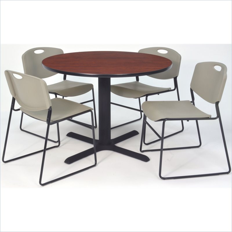 | Regency - Lunchroom Tables - TB42RNDCH44GY - Whether you're planning a lounge, café, library, breakroom or restaurant, let the Cain Collection take you there. These versatile tables are at home in stylish café or coffee shop settings as well as lunch rooms. This set includes one 42-inch round Cain table and four Gray Zeng Stack Chairs. The table is constructed of a thermal fused melamine Cherry laminate tabletop that is 1-inch thick and finished with a black T-Mold edge band. Laminates are scratch, stain and burn resistant and wipe clean easily. The stylish X-Base is constructed of a tubular steel post and solid steel X-Base. Hidden adjustable glides keep the tabletop level and are easy to adjust. Regency's Patent-Pending Zeng stack chair is not only unique, but durable, sturdy and versatile as well. The Zeng seat and back are treated with an anti-microbial agent, which makes it perfect for schools, waiting rooms, cafeterias and more. A reinforced black metal frame is designed to support up to 400lbs and a built in handle makes moving the chair easier. All Regency chairs are backed by a 5-year limited manufacturer's warranty on chair bases and frames and a 2-year limited manufacturer's warranty on chair mechanisms and upholstery. Cain tables are backed by a 10-Year Limited Manufacturer's Warranty. Finish: Cherry/ GrayMaterial: Laminate/ Metal/ PolypropyleneVersatile table & chair set includes one 42-inch round Cain table and 4 Gray Zeng Stack ChairsTabletop is constructed of a 1-inch thick thermal fused melamine laminate finished with a black T-Mold edge bandingCherry laminate tabletop is scratch, stain and burn resistant and wipes clean easilyTreated with an anti-microbial agent, which makes it perfect for schools, cafeterias or waiting roomsChairs have a reinforced black metal frame designed to withstand 400-poundsBuilt-in carrying handle that makes moving easySpecifications:Overall Product Dimensions: 29 H x 42 W x 42 DProduct Weight: 104 lbsChair Dimensio