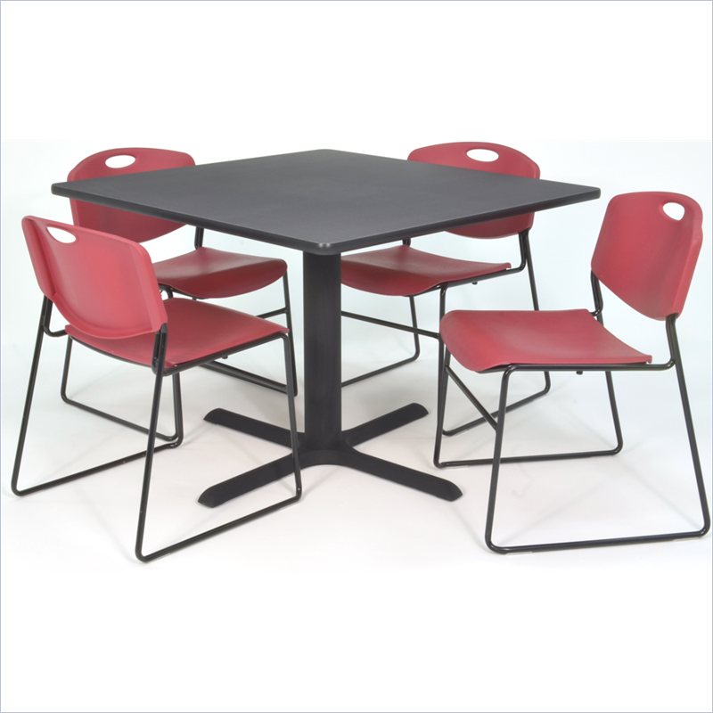 | Regency - Lunchroom Tables - TB4242GY44BY - Whether you're planning a lounge, café, library, breakroom or restaurant, let the Cain Collection take you there. These versatile tables are at home in stylish café or coffee shop settings as well as lunch rooms. This set includes one 42-inch square Cain table and four Burgundy Zeng Stack Chairs. The table is constructed of a thermal fused melamine Gray laminate tabletop that is 1-inch thick and finished with a black T-Mold edge band. Rounded corners make the table safer for everyone. Laminates are scratch, stain and burn resistant and wipe clean easily. The stylish X-Base is constructed of a tubular steel post and solid steel X-Base. Hidden adjustable glides keep the tabletop level and are easy to adjust. Regency's Patent-Pending Zeng stack chair is not only unique, but durable, sturdy and versatile as well. The Zeng seat and back are treated with an anti-microbial agent, which makes it perfect for schools, waiting rooms, cafeterias and more. A reinforced black metal frame is designed to support up to 400lbs and a built in handle makes moving the chair easier. All Regency chairs are backed by a 5-year limited manufacturer's warranty on chair bases and frames and a 2-year limited manufacturer's warranty on chair mechanisms and upholstery. Cain tables are backed by a 10-Year Limited Manufacturer's Warranty. Finish: Gray/ BurgundyMaterial: Laminate/ Metal/ PolypropyleneVersatile table & chair set includes one 42-inch square Cain table and 4 Burgundy Zeng Stack ChairsTabletop is constructed of a 1-inch thick thermal fused melamine laminate finished with a black T-Mold edge bandingGray laminate tabletop is scratch, stain and burn resistant and wipes clean easilyTreated with an anti-microbial agent, which makes it perfect for schools, cafeterias or waiting roomsChairs have a reinforced black metal frame designed to withstand 400-poundsBuilt-in carrying handle that makes moving easySpecifications:Overall Product Dimensions: 29