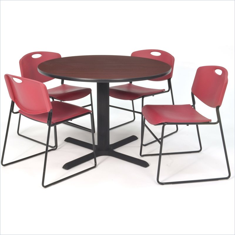 | Regency - Lunchroom Tables - TB42RNDMH44BY - Whether you're planning a lounge, café, library, breakroom or restaurant, let the Cain Collection take you there. These versatile tables are at home in stylish café or coffee shop settings as well as lunch rooms. This set includes one 42-inch round Cain table and four Burgundy Zeng Stack Chairs. The table is constructed of a thermal fused melamine Mahogany laminate tabletop that is 1-inch thick and finished with a black T-Mold edge band. Laminates are scratch, stain and burn resistant and wipe clean easily. The stylish X-Base is constructed of a tubular steel post and solid steel X-Base. Hidden adjustable glides keep the tabletop level and are easy to adjust. Regency's Patent-Pending Zeng stack chair is not only unique, but durable, sturdy and versatile as well. The Zeng seat and back are treated with an anti-microbial agent, which makes it perfect for schools, waiting rooms, cafeterias and more. A reinforced black metal frame is designed to support up to 400lbs and a built in handle makes moving the chair easier. All Regency chairs are backed by a 5-year limited manufacturer's warranty on chair bases and frames and a 2-year limited manufacturer's warranty on chair mechanisms and upholstery. Cain tables are backed by a 10-Year Limited Manufacturer's Warranty. Finish: Mahogany/ BurgundyMaterial: Laminate/ Metal/ PolypropyleneVersatile table & chair set includes one 42-inch round Cain table and 4 Burgundy Zeng Stack ChairsTabletop is constructed of a 1-inch thick thermal fused melamine laminate finished with a black T-Mold edge bandingMahogany laminate tabletop is scratch, stain and burn resistant and wipes clean easilyTreated with an anti-microbial agent, which makes it perfect for schools, cafeterias or waiting roomsChairs have a reinforced black metal frame designed to withstand 400-poundsBuilt-in carrying handle that makes moving easySpecifications:Overall Product Dimensions: 29 H x 42 W x 42 DProduct Weight: 104
