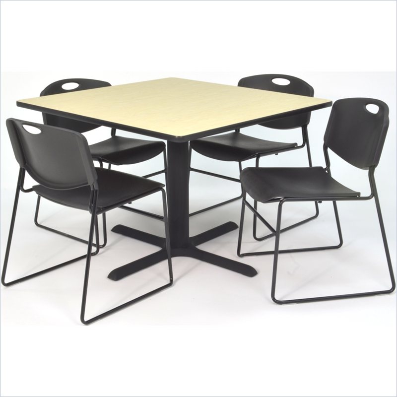| Regency - Lunchroom Tables - TB4242PL44BK - Whether you're planning a lounge, café, library, breakroom or restaurant, let the Cain Collection take you there. These versatile tables are at home in stylish café or coffee shop settings as well as lunch rooms. This set includes one 42-inch square Cain table and four Black Zeng Stack Chairs. The table is constructed of a thermal fused melamine Maple laminate tabletop that is 1-inch thick and finished with a black T-Mold edge band. Rounded corners make the table safer for everyone. Laminates are scratch, stain and burn resistant and wipe clean easily. The stylish X-Base is constructed of a tubular steel post and solid steel X-Base. Hidden adjustable glides keep the tabletop level and are easy to adjust. Regency's Patent-Pending Zeng stack chair is not only unique, but durable, sturdy and versatile as well. The Zeng seat and back are treated with an anti-microbial agent, which makes it perfect for schools, waiting rooms, cafeterias and more. A reinforced black metal frame is designed to support up to 400lbs and a built in handle makes moving the chair easier. All Regency chairs are backed by a 5-year limited manufacturer's warranty on chair bases and frames and a 2-year limited manufacturer's warranty on chair mechanisms and upholstery. Cain tables are backed by a 10-Year Limited Manufacturer's Warranty. Finish: Maple/ BlackMaterial: Laminate/ Metal/ PolypropyleneVersatile table & chair set includes one 42-inch square Cain table and 4 Black Zeng Stack ChairsTabletop is constructed of a 1-inch thick thermal fused melamine laminate finished with a black T-Mold edge bandingMaple laminate tabletop is scratch, stain and burn resistant and wipes clean easilyTreated with an anti-microbial agent, which makes it perfect for schools, cafeterias or waiting roomsChairs have a reinforced black metal frame designed to withstand 400-poundsBuilt-in carrying handle that makes moving easySpecifications:Overall Product Dimensions: 29 H x