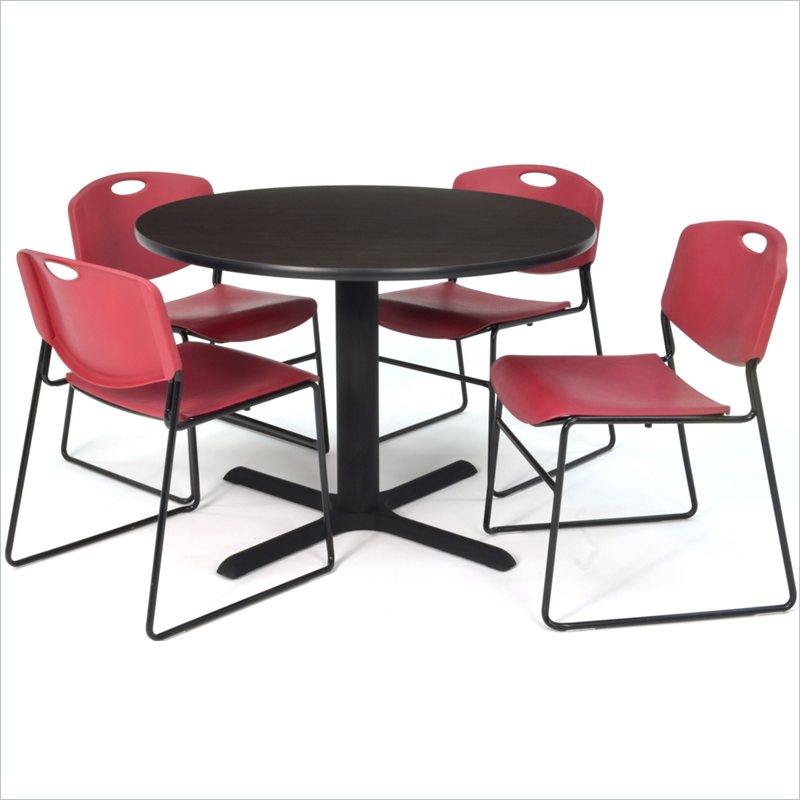 | Regency - Lunchroom Tables - TB42RNDMW44BY - Whether you're planning a lounge, café, library, breakroom or restaurant, let the Cain Collection take you there. These versatile tables are at home in stylish café or coffee shop settings as well as lunch rooms. This set includes one 42-inch round Cain table and four Burgundy Zeng Stack Chairs. The table is constructed of a thermal fused melamine Mocha Walnut laminate tabletop that is 1-inch thick and finished with a black T-Mold edge band. Laminates are scratch, stain and burn resistant and wipe clean easily. The stylish X-Base is constructed of a tubular steel post and solid steel X-Base. Hidden adjustable glides keep the tabletop level and are easy to adjust. Regency's Patent-Pending Zeng stack chair is not only unique, but durable, sturdy and versatile as well. The Zeng seat and back are treated with an anti-microbial agent, which makes it perfect for schools, waiting rooms, cafeterias and more. A reinforced black metal frame is designed to support up to 400lbs and a built in handle makes moving the chair easier. All Regency chairs are backed by a 5-year limited manufacturer's warranty on chair bases and frames and a 2-year limited manufacturer's warranty on chair mechanisms and upholstery. Cain tables are backed by a 10-Year Limited Manufacturer's Warranty. Finish: Mocha Walnut/ BurgundyMaterial: Laminate/ Metal/ PolypropyleneVersatile table & chair set includes one 42-inch round Cain table and 4 Burgundy Zeng Stack ChairsTabletop is constructed of a 1-inch thick thermal fused melamine laminate finished with a black T-Mold edge bandingMocha Walnut laminate tabletop is scratch, stain and burn resistant and wipes clean easilyTreated with an anti-microbial agent, which makes it perfect for schools, cafeterias or waiting roomsChairs have a reinforced black metal frame designed to withstand 400-poundsBuilt-in carrying handle that makes moving easySpecifications:Overall Product Dimensions: 29 H x 42 W x 42 DProduct