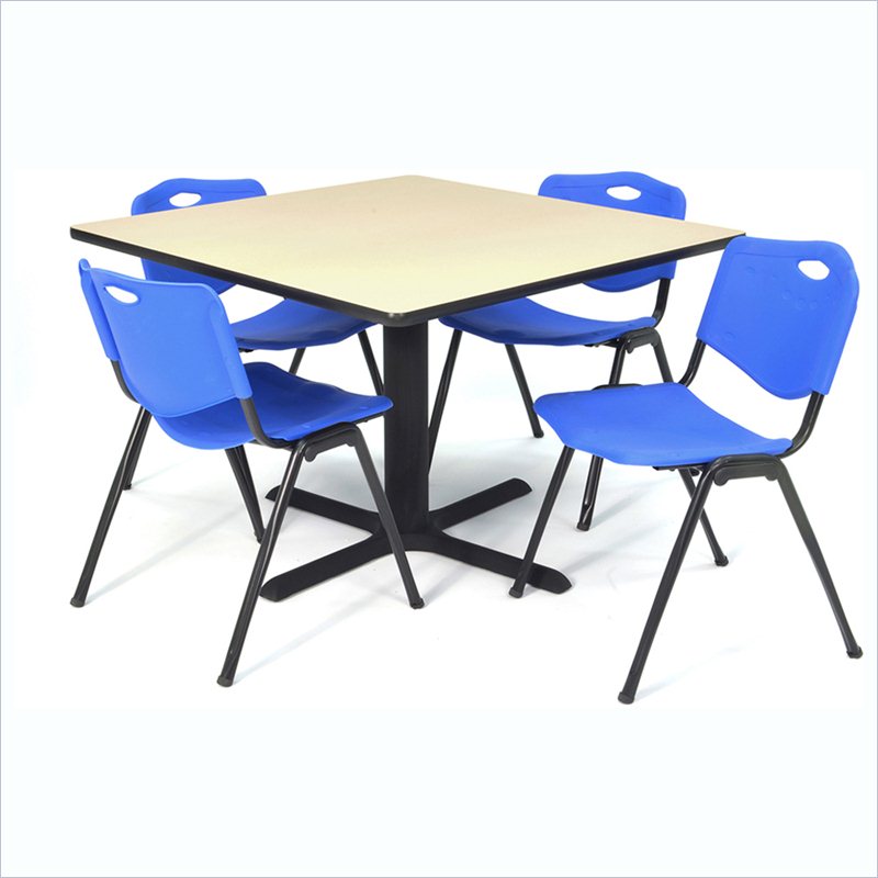| Regency - Lunchroom Tables - TB4848BE47BE - Whether you're planning a lounge, café, library, breakroom or restaurant, let the Cain Collection take you there. These versatile tables are at home in stylish café or coffee shop settings as well as lunch rooms. This set includes one 48-inch square Cain table and four Blue M Stack Chairs. The table is constructed of a thermal fused melamine Beige laminate tabletop that is 1-inch thick and finished with a black T-Mold edge band. Rounded corners make the table safer for everyone. Laminates are scratch, stain and burn resistant and wipe clean easily. The stylish X-Base is constructed of a tubular steel post and solid steel X-Base. Hidden adjustable glides keep the tabletop level and are easy to adjust. The sturdy, lightweight M stack chair by Regency offers durability, style and value. Its black metal frame and contoured plastic seat and back are strong and easy to clean. This versatile stack chair easily stores away in stacks of 12 and features a built in handle for easy mobility. All Regency chairs are backed by a 5-year limited manufacturer's warranty on chair bases and frames and a 2-year limited manufacturer's warranty on chair mechanisms and upholstery. Cain tables are backed by a 10-Year Limited Manufacturer's Warranty. Finish: Beige/ BlueMaterial: Laminate/ Metal/ PlasticVersatile table & chair set includes one 48-inch square Cain table and 4 Blue M Stack ChairsTabletop is constructed of a 1-inch thick thermal fused melamine laminate finished with a black T-Mold edge bandingBeige laminate tabletop is scratch, stain and burn resistant and wipes clean easilyM stack chairs have a black metal frame and controured plastic seat and back with built-in carrying handleSturdy and lightweight chairs can be easily stored away in stacks of 12Compatible with Regency's Universal Stack Chair CartSpecifications:Overall Product Dimensions: 29 H x 48 W x 48 DProduct Weight: 128 lbsChair Dimensions: 36 H x 20
