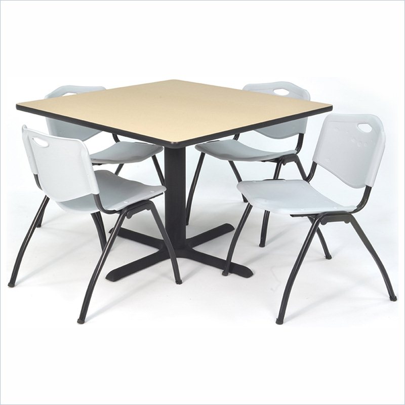 | Regency - Lunchroom Tables - TB4848BE47GY - Whether you're planning a lounge, café, library, breakroom or restaurant, let the Cain Collection take you there. These versatile tables are at home in stylish café or coffee shop settings as well as lunch rooms. This set includes one 48-inch square Cain table and four Gray M Stack Chairs. The table is constructed of a thermal fused melamine Beige laminate tabletop that is 1-inch thick and finished with a black T-Mold edge band. Rounded corners make the table safer for everyone. Laminates are scratch, stain and burn resistant and wipe clean easily. The stylish X-Base is constructed of a tubular steel post and solid steel X-Base. Hidden adjustable glides keep the tabletop level and are easy to adjust. The sturdy, lightweight M stack chair by Regency offers durability, style and value. Its black metal frame and contoured plastic seat and back are strong and easy to clean. This versatile stack chair easily stores away in stacks of 12 and features a built in handle for easy mobility. All Regency chairs are backed by a 5-year limited manufacturer's warranty on chair bases and frames and a 2-year limited manufacturer's warranty on chair mechanisms and upholstery. Cain tables are backed by a 10-Year Limited Manufacturer's Warranty. Finish: Beige/ GrayMaterial: Laminate/ Metal/ PlasticVersatile table & chair set includes one 48-inch square Cain table and 4 Gray M Stack ChairsTabletop is constructed of a 1-inch thick thermal fused melamine laminate finished with a black T-Mold edge bandingBeige laminate tabletop is scratch, stain and burn resistant and wipes clean easilyM stack chairs have a black metal frame and controured plastic seat and back with built-in carrying handleSturdy and lightweight chairs can be easily stored away in stacks of 12Compatible with Regency's Universal Stack Chair CartSpecifications:Overall Product Dimensions: 29 H x 48 W x 48 DProduct Weight: 128 lbsChair Dimensions: 36 H x 20
