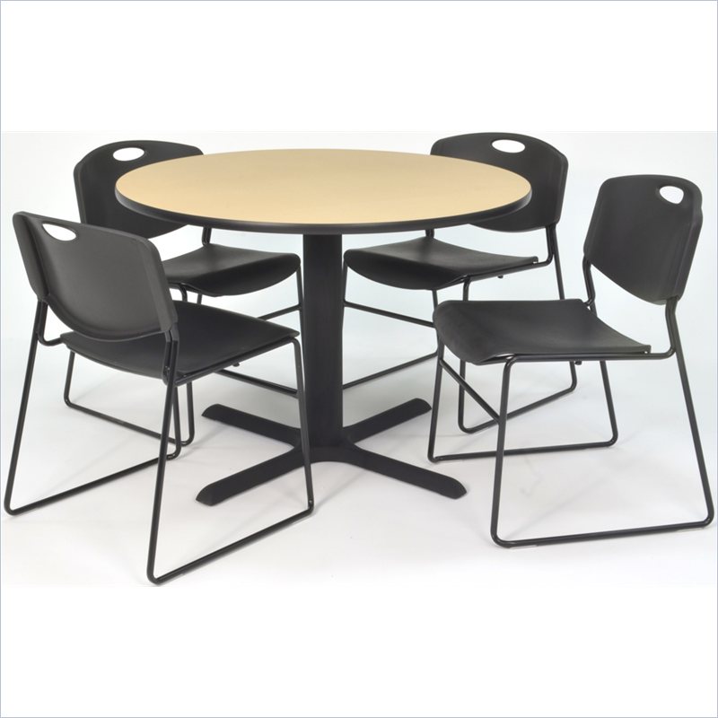 | Regency - Lunchroom Tables - TB48RNDBE44BK - Whether you're planning a lounge, café, library, breakroom or restaurant, let the Cain Collection take you there. These versatile tables are at home in stylish café or coffee shop settings as well as lunch rooms. This set includes one 48-inch round Cain table and four Black Zeng Stack Chairs. The table is constructed of a thermal fused melamine Beige laminate tabletop that is 1-inch thick and finished with a black T-Mold edge band. Laminates are scratch, stain and burn resistant and wipe clean easily. The stylish X-Base is constructed of a tubular steel post and solid steel X-Base. Hidden adjustable glides keep the tabletop level and are easy to adjust. Regency's Patent-Pending Zeng stack chair is not only unique, but durable, sturdy and versatile as well. The Zeng seat and back are treated with an anti-microbial agent, which makes it perfect for schools, waiting rooms, cafeterias and more. A reinforced black metal frame is designed to support up to 400lbs and a built in handle makes moving the chair easier. All Regency chairs are backed by a 5-year limited manufacturer's warranty on chair bases and frames and a 2-year limited manufacturer's warranty on chair mechanisms and upholstery. Cain tables are backed by a 10-Year Limited Manufacturer's Warranty. Finish: Beige/ BlackMaterial: Laminate/ Metal/ PolypropyleneVersatile table & chair set includes one 48-inch round Cain table and 4 Black Zeng Stack ChairsTabletop is constructed of a 1-inch thick thermal fused melamine laminate finished with a black T-Mold edge bandingBeige laminate tabletop is scratch, stain and burn resistant and wipes clean easilyTreated with an anti-microbial agent, which makes it perfect for schools, cafeterias or waiting roomsChairs have a reinforced black metal frame designed to withstand 400-poundsBuilt-in carrying handle that makes moving easySpecifications:Overall Product Dimensions: 29 H x 48 W x 48 DProduct Weight: 127 lbsChair Dimensio