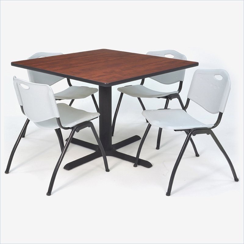 | Regency - Lunchroom Tables - TB4848CH47GY - Whether you're planning a lounge, café, library, breakroom or restaurant, let the Cain Collection take you there. These versatile tables are at home in stylish café or coffee shop settings as well as lunch rooms. This set includes one 48-inch square Cain table and four Gray M Stack Chairs. The table is constructed of a thermal fused melamine Cherry laminate tabletop that is 1-inch thick and finished with a black T-Mold edge band. Rounded corners make the table safer for everyone. Laminates are scratch, stain and burn resistant and wipe clean easily. The stylish X-Base is constructed of a tubular steel post and solid steel X-Base. Hidden adjustable glides keep the tabletop level and are easy to adjust. The sturdy, lightweight M stack chair by Regency offers durability, style and value. Its black metal frame and contoured plastic seat and back are strong and easy to clean. This versatile stack chair easily stores away in stacks of 12 and features a built in handle for easy mobility. All Regency chairs are backed by a 5-year limited manufacturer's warranty on chair bases and frames and a 2-year limited manufacturer's warranty on chair mechanisms and upholstery. Cain tables are backed by a 10-Year Limited Manufacturer's Warranty. Finish: Cherry/ GrayMaterial: Laminate/ Metal/ PlasticVersatile table & chair set includes one 48-inch square Cain table and 4 Gray M Stack ChairsTabletop is constructed of a 1-inch thick thermal fused melamine laminate finished with a black T-Mold edge bandingCherry laminate tabletop is scratch, stain and burn resistant and wipes clean easilyM stack chairs have a black metal frame and controured plastic seat and back with built-in carrying handleSturdy and lightweight chairs can be easily stored away in stacks of 12Compatible with Regency's Universal Stack Chair CartSpecifications:Overall Product Dimensions: 29 H x 48 W x 48 DProduct Weight: 128 lbsChair Dimensions: 36 H x 20