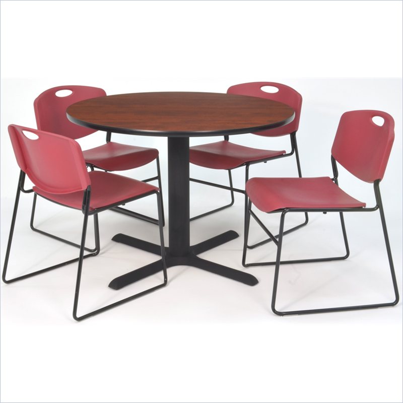 | Regency - Lunchroom Tables - TB48RNDCH44BY - Whether you're planning a lounge, café, library, breakroom or restaurant, let the Cain Collection take you there. These versatile tables are at home in stylish café or coffee shop settings as well as lunch rooms. This set includes one 48-inch round Cain table and four Burgundy Zeng Stack Chairs. The table is constructed of a thermal fused melamine Cherry laminate tabletop that is 1-inch thick and finished with a black T-Mold edge band. Laminates are scratch, stain and burn resistant and wipe clean easily. The stylish X-Base is constructed of a tubular steel post and solid steel X-Base. Hidden adjustable glides keep the tabletop level and are easy to adjust. Regency's Patent-Pending Zeng stack chair is not only unique, but durable, sturdy and versatile as well. The Zeng seat and back are treated with an anti-microbial agent, which makes it perfect for schools, waiting rooms, cafeterias and more. A reinforced black metal frame is designed to support up to 400lbs and a built in handle makes moving the chair easier. All Regency chairs are backed by a 5-year limited manufacturer's warranty on chair bases and frames and a 2-year limited manufacturer's warranty on chair mechanisms and upholstery. Cain tables are backed by a 10-Year Limited Manufacturer's Warranty. Finish: Cherry/ BurgundyMaterial: Laminate/ Metal/ PolypropyleneVersatile table & chair set includes one 48-inch round Cain table and 4 Burgundy Zeng Stack ChairsTabletop is constructed of a 1-inch thick thermal fused melamine laminate finished with a black T-Mold edge bandingCherry laminate tabletop is scratch, stain and burn resistant and wipes clean easilyTreated with an anti-microbial agent, which makes it perfect for schools, cafeterias or waiting roomsChairs have a reinforced black metal frame designed to withstand 400-poundsBuilt-in carrying handle that makes moving easySpecifications:Overall Product Dimensions: 29 H x 48 W x 48 DProduct Weight: 127 lbsCh