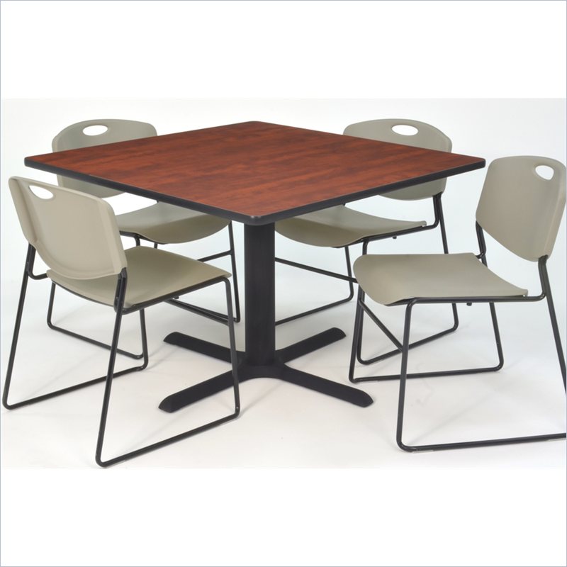 | Regency - Lunchroom Tables - TB4848CH44GY - Whether you're planning a lounge, café, library, breakroom or restaurant, let the Cain Collection take you there. These versatile tables are at home in stylish café or coffee shop settings as well as lunch rooms. This set includes one 48-inch square Cain table and four Gray Zeng Stack Chairs. The table is constructed of a thermal fused melamine Cherry laminate tabletop that is 1-inch thick and finished with a black T-Mold edge band. Rounded corners make the table safer for everyone. Laminates are scratch, stain and burn resistant and wipe clean easily. The stylish X-Base is constructed of a tubular steel post and solid steel X-Base. Hidden adjustable glides keep the tabletop level and are easy to adjust. Regency's Patent-Pending Zeng stack chair is not only unique, but durable, sturdy and versatile as well. The Zeng seat and back are treated with an anti-microbial agent, which makes it perfect for schools, waiting rooms, cafeterias and more. A reinforced black metal frame is designed to support up to 400lbs and a built in handle makes moving the chair easier. All Regency chairs are backed by a 5-year limited manufacturer's warranty on chair bases and frames and a 2-year limited manufacturer's warranty on chair mechanisms and upholstery. Cain tables are backed by a 10-Year Limited Manufacturer's Warranty. Finish: Cherry/ GrayMaterial: Laminate/ Metal/ PolypropyleneVersatile table & chair set includes one 48-inch square Cain table and 4 Gray Zeng Stack ChairsTabletop is constructed of a 1-inch thick thermal fused melamine laminate finished with a black T-Mold edge bandingCherry laminate tabletop is scratch, stain and burn resistant and wipes clean easilyTreated with an anti-microbial agent, which makes it perfect for schools, cafeterias or waiting roomsChairs have a reinforced black metal frame designed to withstand 400-poundsBuilt-in carrying handle that makes moving easySpecifications:Overall Product Dimensions: 29 H x