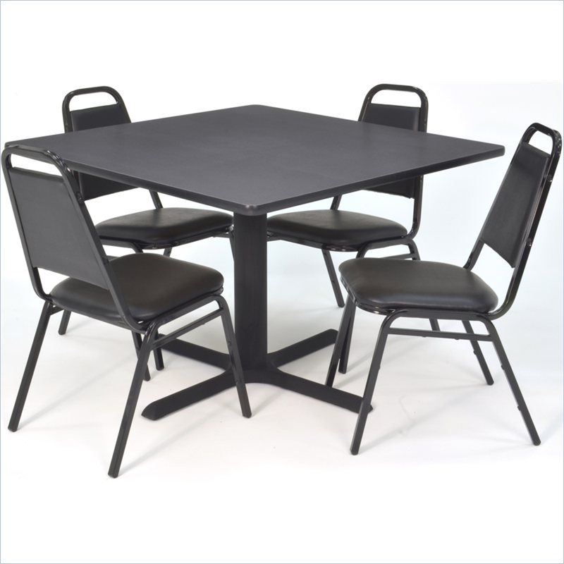 | Regency - Lunchroom Tables - TB4848GY29BK - Whether you're planning a lounge, café, library, breakroom or restaurant, let the Cain Collection take you there. These versatile tables are at home in stylish café or coffee shop settings as well as lunch rooms. This set includes one 48-inch square Cain table and four Restaurant Stack Chairs. The table is constructed of a thermal fused melamine Gray laminate tabletop that is 1-inch thick and finished with a black T-Mold edge band. Rounded corners make the table safer for everyone. Laminates are scratch, stain and burn resistant and wipe clean easily. The stylish X-Base is constructed of a tubular steel post and solid steel X-Base. Hidden adjustable glides keep the tabletop level and are easy to adjust. Inspired by the classic black café look, the Restaurant Stack Chair is designed for use in almost any setting. The water-repellent vinyl seat and back easily wipe clean with a damp cloth. Reinforced cross-bracing on the black metal frame make this versatile stack chair suitable for every day wear and tear. It can easily be stored away in stacks of 12. All Regency chairs are backed by a 5-year limited manufacturer's warranty on chair bases and frames and a 2-year limited manufacturer's warranty on chair mechanisms and upholstery. Cain tables are backed by a 10-Year Limited Manufacturer's Warranty. Finish: Gray/ BlackMaterial: Laminate/ Metal/ VinylVersatile table & chair set includes one 48-inch square Cain table and 4 Restaurant Stack ChairsTabletop is constructed of a 1-inch thick thermal fused melamine laminate finished with a black T-Mold edge bandingGray laminate tabletop is scratch, stain and burn resistant and wipes clean easilyRestaurant stack chairs have a water-repellent black vinyl seat and backBlack metal frame with reinforced cross bracingStack chairs can easily be stored away in stacks of 12 and are compatible with Regency's Universal Stack Chair CartSpecifications:Overall Product Dimensions: 29 H x 48 W x