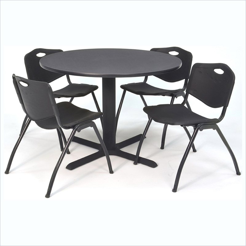 | Regency - Lunchroom Tables - TB48RNDGY47BK - Whether you're planning a lounge, café, library, breakroom or restaurant, let the Cain Collection take you there. These versatile tables are at home in stylish café or coffee shop settings as well as lunch rooms. This set includes one 48-inch round Cain table and four Black M Stack Chairs. The table is constructed of a thermal fused melamine Gray laminate tabletop that is 1-inch thick and finished with a black T-Mold edge band. Laminates are scratch, stain and burn resistant and wipe clean easily. The stylish X-Base is constructed of a tubular steel post and solid steel X-Base. Hidden adjustable glides keep the tabletop level and are easy to adjust. The sturdy, lightweight M stack chair by Regency offers durability, style and value. Its black metal frame and contoured plastic seat and back are strong and easy to clean. This versatile stack chair easily stores away in stacks of 12 and features a built in handle for easy mobility. All Regency chairs are backed by a 5-year limited manufacturer's warranty on chair bases and frames and a 2-year limited manufacturer's warranty on chair mechanisms and upholstery. Cain tables are backed by a 10-Year Limited Manufacturer's Warranty. Finish: Gray/ BlackMaterial: Laminate/ Metal/ PlasticVersatile table & chair set includes one 48-inch round Cain table and 4 Black M Stack ChairsTabletop is constructed of a 1-inch thick thermal fused melamine laminate finished with a black T-Mold edge bandingGray laminate tabletop is scratch, stain and burn resistant and wipes clean easilyM stack chairs have a black metal frame and controured plastic seat and back with built-in carrying handleSturdy and lightweight chairs can be easily stored away in stacks of 12Compatible with Regency's Universal Stack Chair CartSpecifications:Overall Product Dimensions: 29 H x 48 W x 48 DProduct Weight: 119 lbsChair Dimensions: 36 H x 20 W x 23 D