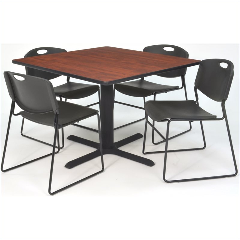 | Regency - Lunchroom Tables - TB4848GY44BK - Whether you're planning a lounge, café, library, breakroom or restaurant, let the Cain Collection take you there. These versatile tables are at home in stylish café or coffee shop settings as well as lunch rooms. This set includes one 48-inch square Cain table and four Black Zeng Stack Chairs. The table is constructed of a thermal fused melamine Gray laminate tabletop that is 1-inch thick and finished with a black T-Mold edge band. Rounded corners make the table safer for everyone. Laminates are scratch, stain and burn resistant and wipe clean easily. The stylish X-Base is constructed of a tubular steel post and solid steel X-Base. Hidden adjustable glides keep the tabletop level and are easy to adjust. Regency's Patent-Pending Zeng stack chair is not only unique, but durable, sturdy and versatile as well. The Zeng seat and back are treated with an anti-microbial agent, which makes it perfect for schools, waiting rooms, cafeterias and more. A reinforced black metal frame is designed to support up to 400lbs and a built in handle makes moving the chair easier. All Regency chairs are backed by a 5-year limited manufacturer's warranty on chair bases and frames and a 2-year limited manufacturer's warranty on chair mechanisms and upholstery. Cain tables are backed by a 10-Year Limited Manufacturer's Warranty. Finish: Gray/ BlackMaterial: Laminate/ Metal/ PolypropyleneVersatile table & chair set includes one 48-inch square Cain table and 4 Black Zeng Stack ChairsTabletop is constructed of a 1-inch thick thermal fused melamine laminate finished with a black T-Mold edge bandingGray laminate tabletop is scratch, stain and burn resistant and wipes clean easilyTreated with an anti-microbial agent, which makes it perfect for schools, cafeterias or waiting roomsChairs have a reinforced black metal frame designed to withstand 400-poundsBuilt-in carrying handle that makes moving easySpecifications:Overall Product Dimensions: 29 H x 48