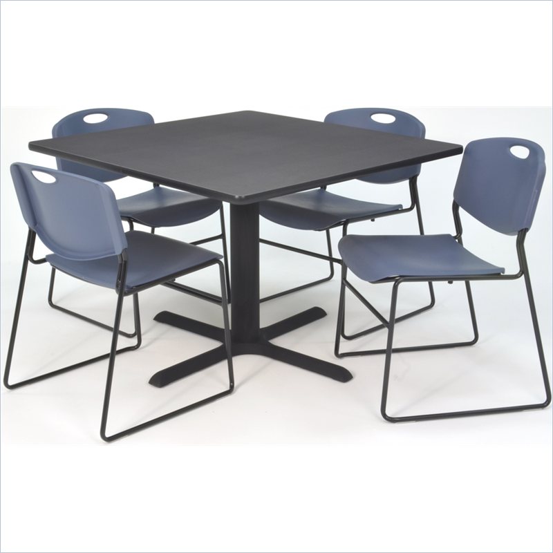 | Regency - Lunchroom Tables - TB4848GY44BE - Whether you're planning a lounge, café, library, breakroom or restaurant, let the Cain Collection take you there. These versatile tables are at home in stylish café or coffee shop settings as well as lunch rooms. This set includes one 48-inch square Cain table and four Blue Zeng Stack Chairs. The table is constructed of a thermal fused melamine Gray laminate tabletop that is 1-inch thick and finished with a black T-Mold edge band. Rounded corners make the table safer for everyone. Laminates are scratch, stain and burn resistant and wipe clean easily. The stylish X-Base is constructed of a tubular steel post and solid steel X-Base. Hidden adjustable glides keep the tabletop level and are easy to adjust. Regency's Patent-Pending Zeng stack chair is not only unique, but durable, sturdy and versatile as well. The Zeng seat and back are treated with an anti-microbial agent, which makes it perfect for schools, waiting rooms, cafeterias and more. A reinforced black metal frame is designed to support up to 400lbs and a built in handle makes moving the chair easier. All Regency chairs are backed by a 5-year limited manufacturer's warranty on chair bases and frames and a 2-year limited manufacturer's warranty on chair mechanisms and upholstery. Cain tables are backed by a 10-Year Limited Manufacturer's Warranty. Finish: Gray/ BlueMaterial: Laminate/ Metal/ PolypropyleneVersatile table & chair set includes one 48-inch square Cain table and 4 Blue Zeng Stack ChairsTabletop is constructed of a 1-inch thick thermal fused melamine laminate finished with a black T-Mold edge bandingGray laminate tabletop is scratch, stain and burn resistant and wipes clean easilyTreated with an anti-microbial agent, which makes it perfect for schools, cafeterias or waiting roomsChairs have a reinforced black metal frame designed to withstand 400-poundsBuilt-in carrying handle that makes moving easySpecifications:Overall Product Dimensions: 29 H x 48 W
