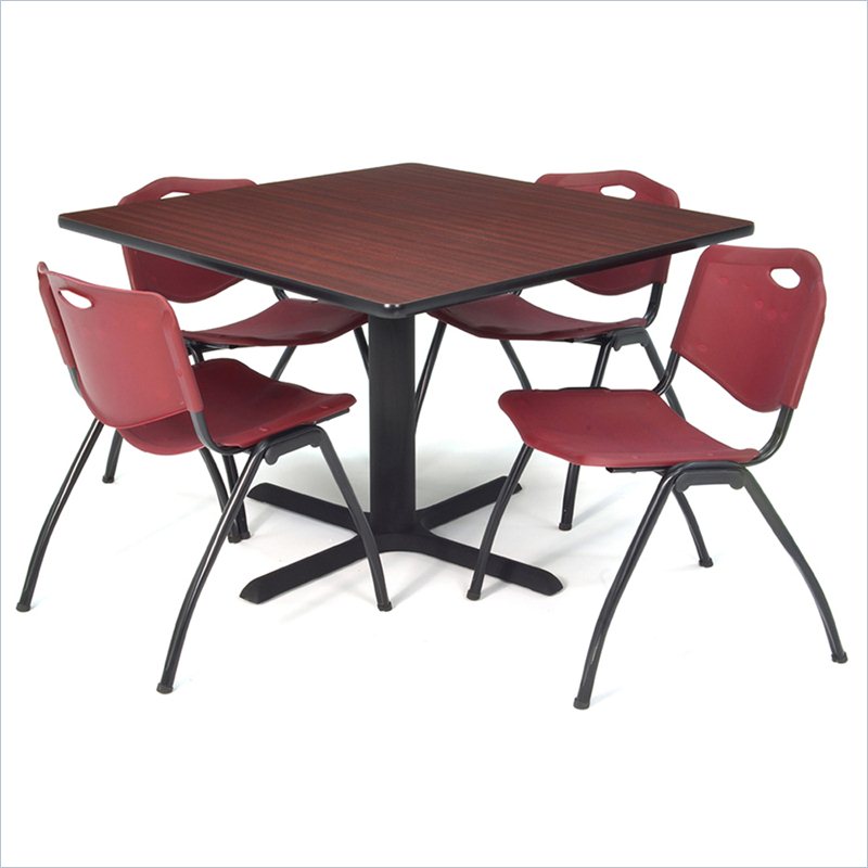 | Regency - Lunchroom Tables - TB4848MH47BY - Whether you're planning a lounge, café, library, breakroom or restaurant, let the Cain Collection take you there. These versatile tables are at home in stylish café or coffee shop settings as well as lunch rooms. This set includes one 48-inch square Cain table and four Burgundy M Stack Chairs. The table is constructed of a thermal fused melamine Mahogany laminate tabletop that is 1-inch thick and finished with a black T-Mold edge band. Rounded corners make the table safer for everyone. Laminates are scratch, stain and burn resistant and wipe clean easily. The stylish X-Base is constructed of a tubular steel post and solid steel X-Base. Hidden adjustable glides keep the tabletop level and are easy to adjust. The sturdy, lightweight M stack chair by Regency offers durability, style and value. Its black metal frame and contoured plastic seat and back are strong and easy to clean. This versatile stack chair easily stores away in stacks of 12 and features a built in handle for easy mobility. All Regency chairs are backed by a 5-year limited manufacturer's warranty on chair bases and frames and a 2-year limited manufacturer's warranty on chair mechanisms and upholstery. Cain tables are backed by a 10-Year Limited Manufacturer's Warranty. Finish: Mahogany/ BurgundyMaterial: Laminate/ Metal/ PlasticVersatile table & chair set includes one 48-inch square Cain table and 4 Burgundy M Stack ChairsTabletop is constructed of a 1-inch thick thermal fused melamine laminate finished with a black T-Mold edge bandingMahogany laminate tabletop is scratch, stain and burn resistant and wipes clean easilyM stack chairs have a black metal frame and controured plastic seat and back with built-in carrying handleSturdy and lightweight chairs can be easily stored away in stacks of 12Compatible with Regency's Universal Stack Chair CartSpecifications:Overall Product Dimensions: 29 H x 48 W x 48 DProduct Weight: 128 lbsChair Dimen
