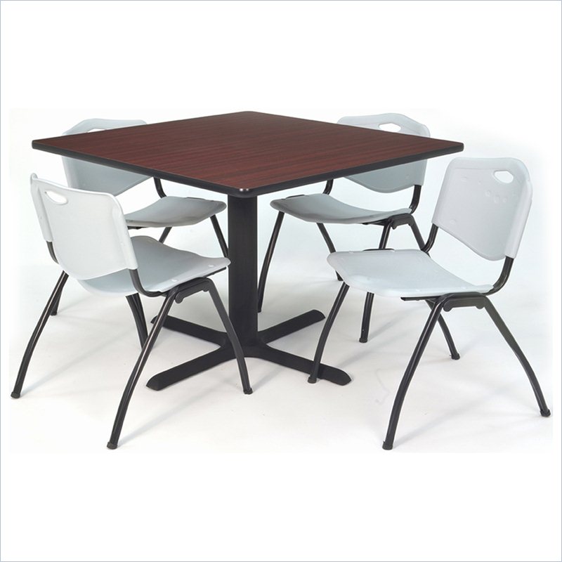 | Regency - Lunchroom Tables - TB4848MH47GY - Whether you're planning a lounge, café, library, breakroom or restaurant, let the Cain Collection take you there. These versatile tables are at home in stylish café or coffee shop settings as well as lunch rooms. This set includes one 48-inch square Cain table and four Gray M Stack Chairs. The table is constructed of a thermal fused melamine Mahogany laminate tabletop that is 1-inch thick and finished with a black T-Mold edge band. Rounded corners make the table safer for everyone. Laminates are scratch, stain and burn resistant and wipe clean easily. The stylish X-Base is constructed of a tubular steel post and solid steel X-Base. Hidden adjustable glides keep the tabletop level and are easy to adjust. The sturdy, lightweight M stack chair by Regency offers durability, style and value. Its black metal frame and contoured plastic seat and back are strong and easy to clean. This versatile stack chair easily stores away in stacks of 12 and features a built in handle for easy mobility. All Regency chairs are backed by a 5-year limited manufacturer's warranty on chair bases and frames and a 2-year limited manufacturer's warranty on chair mechanisms and upholstery. Cain tables are backed by a 10-Year Limited Manufacturer's Warranty. Finish: Mahogany/ GrayMaterial: Laminate/ Metal/ PlasticVersatile table & chair set includes one 48-inch square Cain table and 4 Gray M Stack ChairsTabletop is constructed of a 1-inch thick thermal fused melamine laminate finished with a black T-Mold edge bandingMahogany laminate tabletop is scratch, stain and burn resistant and wipes clean easilyM stack chairs have a black metal frame and controured plastic seat and back with built-in carrying handleSturdy and lightweight chairs can be easily stored away in stacks of 12Compatible with Regency's Universal Stack Chair CartSpecifications:Overall Product Dimensions: 29 H x 48 W x 48 DProduct Weight: 128 lbsChair Dimensions: 36