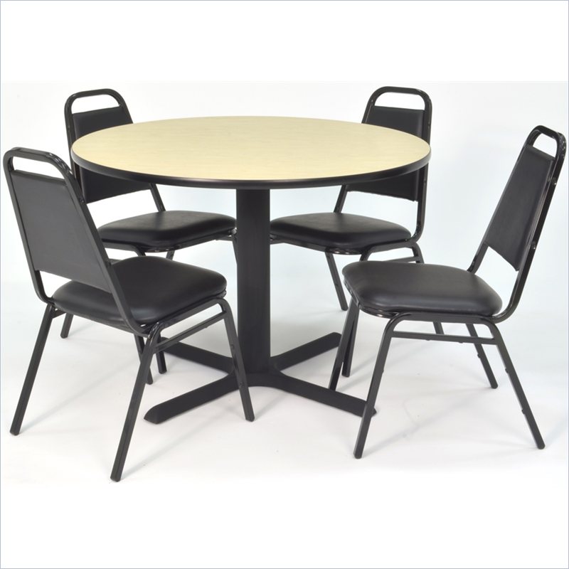 | Regency - Lunchroom Tables - TB48RNDPL29BK - Whether you're planning a lounge, café, library, breakroom or restaurant, let the Cain Collection take you there. These versatile tables are at home in stylish café or coffee shop settings as well as lunch rooms. This set includes one 48-inch round Cain table and four Restaurant Stack Chairs. The table is constructed of a thermal fused melamine Maple laminate tabletop that is 1-inch thick and finished with a black T-Mold edge band. Laminates are scratch, stain and burn resistant and wipe clean easily. The stylish X-Base is constructed of a tubular steel post and solid steel X-Base. Hidden adjustable glides keep the tabletop level and are easy to adjust. Inspired by the classic black café look, the Restaurant Stack Chair is designed for use in almost any setting. The water-repellent vinyl seat and back easily wipe clean with a damp cloth. Reinforced cross-bracing on the black metal frame make this versatile stack chair suitable for every day wear and tear. It can easily be stored away in stacks of 12. All Regency chairs are backed by a 5-year limited manufacturer's warranty on chair bases and frames and a 2-year limited manufacturer's warranty on chair mechanisms and upholstery. Cain tables are backed by a 10-Year Limited Manufacturer's Warranty. Finish: Maple/ BlackMaterial: Laminate/ Metal/ VinylVersatile table & chair set includes one 48-inch round Cain table and 4 Restaurant Stack ChairsTabletop is constructed of a 1-inch thick thermal fused melamine laminate finished with a black T-Mold edge bandingMaple laminate tabletop is scratch, stain and burn resistant and wipes clean easilyRestaurant stack chairs have a water-repellent black vinyl seat and backBlack metal frame with reinforced cross bracingStack chairs can easily be stored away in stacks of 12 and are compatible with Regency's Universal Stack Chair CartSpecifications:Overall Product Dimensions: 29 H x 48 W x 48 DProduct Weight: 127 lbsChair Dimensions: 3