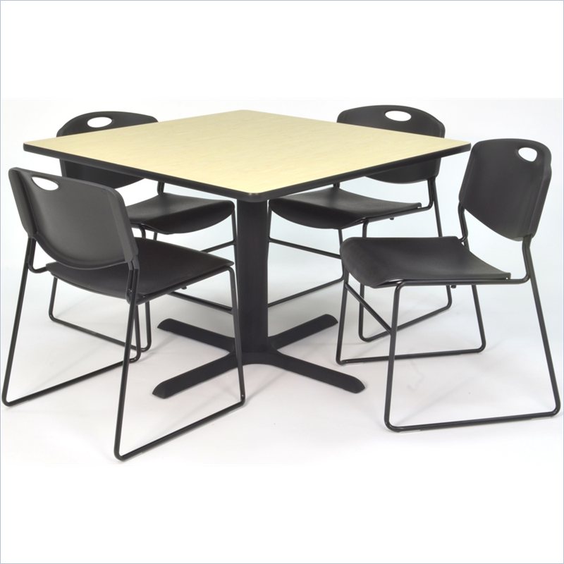 | Regency - Lunchroom Tables - TB4848PL44BK - Whether you're planning a lounge, café, library, breakroom or restaurant, let the Cain Collection take you there. These versatile tables are at home in stylish café or coffee shop settings as well as lunch rooms. This set includes one 48-inch square Cain table and four Black Zeng Stack Chairs. The table is constructed of a thermal fused melamine Maple laminate tabletop that is 1-inch thick and finished with a black T-Mold edge band. Rounded corners make the table safer for everyone. Laminates are scratch, stain and burn resistant and wipe clean easily. The stylish X-Base is constructed of a tubular steel post and solid steel X-Base. Hidden adjustable glides keep the tabletop level and are easy to adjust. Regency's Patent-Pending Zeng stack chair is not only unique, but durable, sturdy and versatile as well. The Zeng seat and back are treated with an anti-microbial agent, which makes it perfect for schools, waiting rooms, cafeterias and more. A reinforced black metal frame is designed to support up to 400lbs and a built in handle makes moving the chair easier. All Regency chairs are backed by a 5-year limited manufacturer's warranty on chair bases and frames and a 2-year limited manufacturer's warranty on chair mechanisms and upholstery. Cain tables are backed by a 10-Year Limited Manufacturer's Warranty. Finish: Maple/ BlackMaterial: Laminate/ Metal/ PolypropyleneVersatile table & chair set includes one 48-inch square Cain table and 4 Black Zeng Stack ChairsTabletop is constructed of a 1-inch thick thermal fused melamine laminate finished with a black T-Mold edge bandingMaple laminate tabletop is scratch, stain and burn resistant and wipes clean easilyTreated with an anti-microbial agent, which makes it perfect for schools, cafeterias or waiting roomsChairs have a reinforced black metal frame designed to withstand 400-poundsBuilt-in carrying handle that makes moving easySpecifications:Overall Product Dimensions: 29 H x