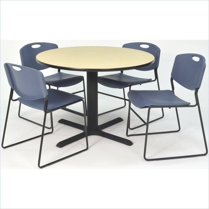 | Regency - Lunchroom Tables - TB48RNDPL44BE - Whether you're planning a lounge, café, library, breakroom or restaurant, let the Cain Collection take you there. These versatile tables are at home in stylish café or coffee shop settings as well as lunch rooms. This set includes one 48-inch round Cain table and four Blue Zeng Stack Chairs. The table is constructed of a thermal fused melamine Maple laminate tabletop that is 1-inch thick and finished with a black T-Mold edge band. Laminates are scratch, stain and burn resistant and wipe clean easily. The stylish X-Base is constructed of a tubular steel post and solid steel X-Base. Hidden adjustable glides keep the tabletop level and are easy to adjust. Regency's Patent-Pending Zeng stack chair is not only unique, but durable, sturdy and versatile as well. The Zeng seat and back are treated with an anti-microbial agent, which makes it perfect for schools, waiting rooms, cafeterias and more. A reinforced black metal frame is designed to support up to 400lbs and a built in handle makes moving the chair easier. All Regency chairs are backed by a 5-year limited manufacturer's warranty on chair bases and frames and a 2-year limited manufacturer's warranty on chair mechanisms and upholstery. Cain tables are backed by a 10-Year Limited Manufacturer's Warranty. Finish: Maple/ BlueMaterial: Laminate/ Metal/ PolypropyleneVersatile table & chair set includes one 48-inch round Cain table and 4 Blue Zeng Stack ChairsTabletop is constructed of a 1-inch thick thermal fused melamine laminate finished with a black T-Mold edge bandingMaple laminate tabletop is scratch, stain and burn resistant and wipes clean easilyTreated with an anti-microbial agent, which makes it perfect for schools, cafeterias or waiting roomsChairs have a reinforced black metal frame designed to withstand 400-poundsBuilt-in carrying handle that makes moving easySpecifications:Overall Product Dimensions: 29 H x 48 W x 48 DProduct Weight: 127 lbsChair Dimensions: