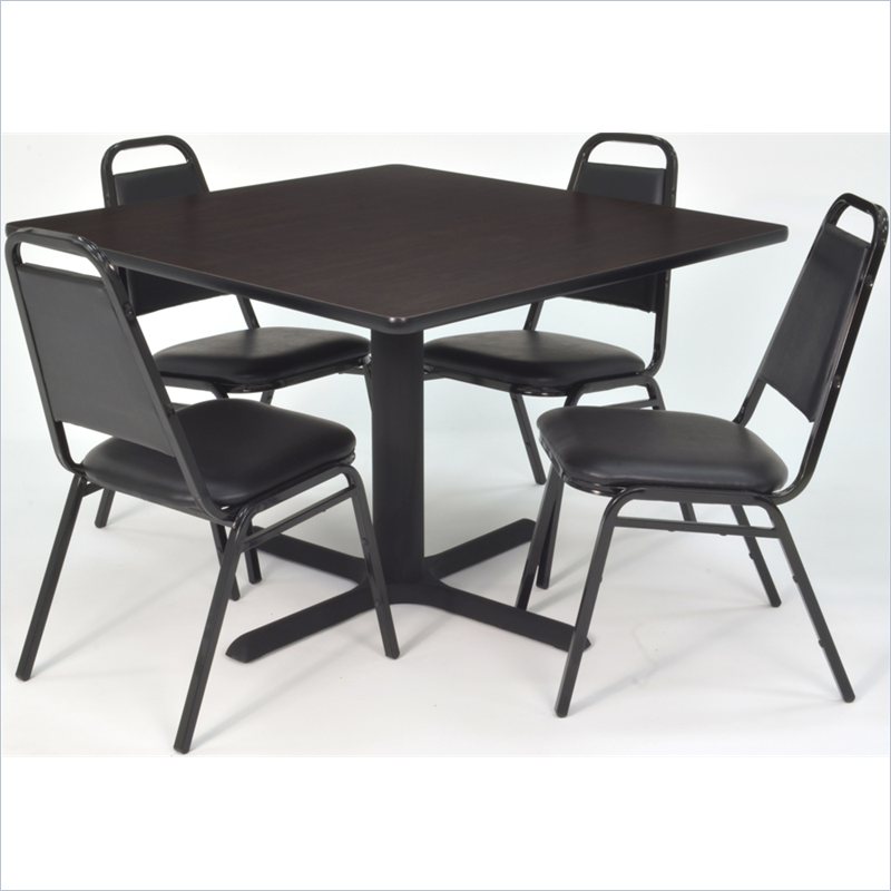 | Regency - Lunchroom Tables - TB4848MW29BK - Whether you're planning a lounge, café, library, breakroom or restaurant, let the Cain Collection take you there. These versatile tables are at home in stylish café or coffee shop settings as well as lunch rooms. This set includes one 48-inch square Cain table and four Restaurant Stack Chairs. The table is constructed of a thermal fused melamine Mocha Walnut laminate tabletop that is 1-inch thick and finished with a black T-Mold edge band. Rounded corners make the table safer for everyone. Laminates are scratch, stain and burn resistant and wipe clean easily. The stylish X-Base is constructed of a tubular steel post and solid steel X-Base. Hidden adjustable glides keep the tabletop level and are easy to adjust. Inspired by the classic black café look, the Restaurant Stack Chair is designed for use in almost any setting. The water-repellent vinyl seat and back easily wipe clean with a damp cloth. Reinforced cross-bracing on the black metal frame make this versatile stack chair suitable for every day wear and tear. It can easily be stored away in stacks of 12. All Regency chairs are backed by a 5-year limited manufacturer's warranty on chair bases and frames and a 2-year limited manufacturer's warranty on chair mechanisms and upholstery. Cain tables are backed by a 10-Year Limited Manufacturer's Warranty. Finish: Mocha Walnut/ BlackMaterial: Laminate/ Metal/ VinylVersatile table & chair set includes one 48-inch square Cain table and 4 Restaurant Stack ChairsTabletop is constructed of a 1-inch thick thermal fused melamine laminate finished with a black T-Mold edge bandingMocha Walnut laminate tabletop is scratch, stain and burn resistant and wipes clean easilyRestaurant stack chairs have a water-repellent black vinyl seat and backBlack metal frame with reinforced cross bracingStack chairs can easily be stored away in stacks of 12 and are compatible with Regency's Universal Stack Chair CartSpecifications:Overall Product Dimen