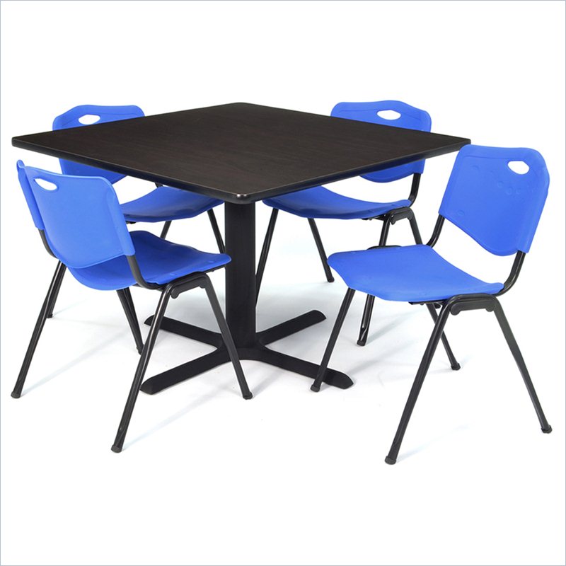 | Regency - Lunchroom Tables - TB4848MW47BE - Whether you're planning a lounge, café, library, breakroom or restaurant, let the Cain Collection take you there. These versatile tables are at home in stylish café or coffee shop settings as well as lunch rooms. This set includes one 48-inch square Cain table and four Blue M Stack Chairs. The table is constructed of a thermal fused melamine Mocha Walnut laminate tabletop that is 1-inch thick and finished with a black T-Mold edge band. Rounded corners make the table safer for everyone. Laminates are scratch, stain and burn resistant and wipe clean easily. The stylish X-Base is constructed of a tubular steel post and solid steel X-Base. Hidden adjustable glides keep the tabletop level and are easy to adjust. The sturdy, lightweight M stack chair by Regency offers durability, style and value. Its black metal frame and contoured plastic seat and back are strong and easy to clean. This versatile stack chair easily stores away in stacks of 12 and features a built in handle for easy mobility. All Regency chairs are backed by a 5-year limited manufacturer's warranty on chair bases and frames and a 2-year limited manufacturer's warranty on chair mechanisms and upholstery. Cain tables are backed by a 10-Year Limited Manufacturer's Warranty. Finish: Mocha Walnut/ BlueMaterial: Laminate/ Metal/ PlasticVersatile table & chair set includes one 48-inch square Cain table and 4 Blue M Stack ChairsTabletop is constructed of a 1-inch thick thermal fused melamine laminate finished with a black T-Mold edge bandingMocha Walnut laminate tabletop is scratch, stain and burn resistant and wipes clean easilyM stack chairs have a black metal frame and controured plastic seat and back with built-in carrying handleSturdy and lightweight chairs can be easily stored away in stacks of 12Compatible with Regency's Universal Stack Chair CartSpecifications:Overall Product Dimensions: 29 H x 48 W x 48 DProduct Weight: 128 lbsChair Dimen