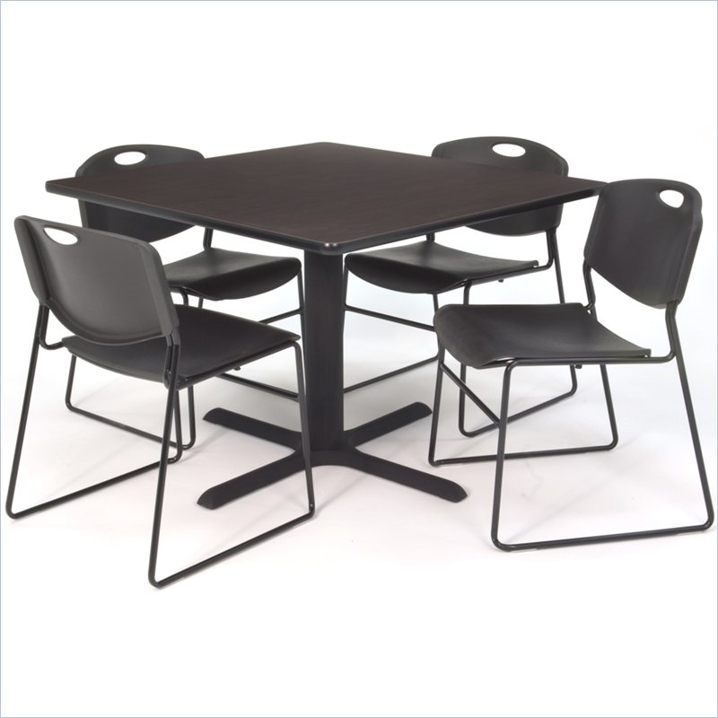 | Regency - Lunchroom Tables - TB4848MW44BK - Whether you're planning a lounge, café, library, breakroom or restaurant, let the Cain Collection take you there. These versatile tables are at home in stylish café or coffee shop settings as well as lunch rooms. This set includes one 48-inch square Cain table and four Black Zeng Stack Chairs. The table is constructed of a thermal fused melamine Mocha Walnut laminate tabletop that is 1-inch thick and finished with a black T-Mold edge band. Rounded corners make the table safer for everyone. Laminates are scratch, stain and burn resistant and wipe clean easily. The stylish X-Base is constructed of a tubular steel post and solid steel X-Base. Hidden adjustable glides keep the tabletop level and are easy to adjust. Regency's Patent-Pending Zeng stack chair is not only unique, but durable, sturdy and versatile as well. The Zeng seat and back are treated with an anti-microbial agent, which makes it perfect for schools, waiting rooms, cafeterias and more. A reinforced black metal frame is designed to support up to 400lbs and a built in handle makes moving the chair easier. All Regency chairs are backed by a 5-year limited manufacturer's warranty on chair bases and frames and a 2-year limited manufacturer's warranty on chair mechanisms and upholstery. Cain tables are backed by a 10-Year Limited Manufacturer's Warranty. Finish: Mocha Walnut/ BlackMaterial: Laminate/ Metal/ PolypropyleneVersatile table & chair set includes one 48-inch square Cain table and 4 Black Zeng Stack ChairsTabletop is constructed of a 1-inch thick thermal fused melamine laminate finished with a black T-Mold edge bandingMocha Walnut laminate tabletop is scratch, stain and burn resistant and wipes clean easilyTreated with an anti-microbial agent, which makes it perfect for schools, cafeterias or waiting roomsChairs have a reinforced black metal frame designed to withstand 400-poundsBuilt-in carrying handle that makes moving easySpecifications:Overall Product