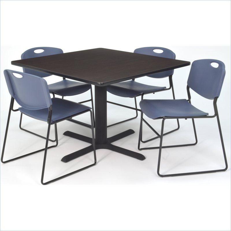 | Regency - Lunchroom Tables - TB4848MW44BE - Whether you're planning a lounge, café, library, breakroom or restaurant, let the Cain Collection take you there. These versatile tables are at home in stylish café or coffee shop settings as well as lunch rooms. This set includes one 48-inch square Cain table and four Blue Zeng Stack Chairs. The table is constructed of a thermal fused melamine Mocha Walnut laminate tabletop that is 1-inch thick and finished with a black T-Mold edge band. Rounded corners make the table safer for everyone. Laminates are scratch, stain and burn resistant and wipe clean easily. The stylish X-Base is constructed of a tubular steel post and solid steel X-Base. Hidden adjustable glides keep the tabletop level and are easy to adjust. Regency's Patent-Pending Zeng stack chair is not only unique, but durable, sturdy and versatile as well. The Zeng seat and back are treated with an anti-microbial agent, which makes it perfect for schools, waiting rooms, cafeterias and more. A reinforced black metal frame is designed to support up to 400lbs and a built in handle makes moving the chair easier. All Regency chairs are backed by a 5-year limited manufacturer's warranty on chair bases and frames and a 2-year limited manufacturer's warranty on chair mechanisms and upholstery. Cain tables are backed by a 10-Year Limited Manufacturer's Warranty. Finish: Mocha Walnut/ BlueMaterial: Laminate/ Metal/ PolypropyleneVersatile table & chair set includes one 48-inch square Cain table and 4 Blue Zeng Stack ChairsTabletop is constructed of a 1-inch thick thermal fused melamine laminate finished with a black T-Mold edge bandingMocha Walnut laminate tabletop is scratch, stain and burn resistant and wipes clean easilyTreated with an anti-microbial agent, which makes it perfect for schools, cafeterias or waiting roomsChairs have a reinforced black metal frame designed to withstand 400-poundsBuilt-in carrying handle that makes moving easySpecifications:Overall Product Dim