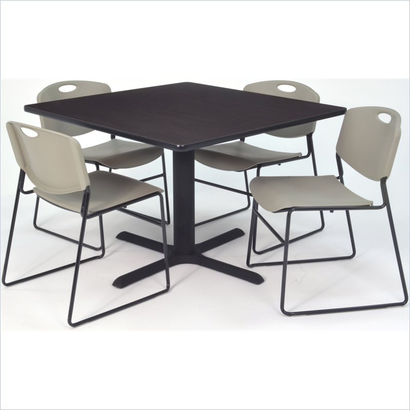 | Regency - Lunchroom Tables - TB4848MW44GY - Whether you're planning a lounge, café, library, breakroom or restaurant, let the Cain Collection take you there. These versatile tables are at home in stylish café or coffee shop settings as well as lunch rooms. This set includes one 48-inch square Cain table and four Gray Zeng Stack Chairs. The table is constructed of a thermal fused melamine Mocha Walnut laminate tabletop that is 1-inch thick and finished with a black T-Mold edge band. Rounded corners make the table safer for everyone. Laminates are scratch, stain and burn resistant and wipe clean easily. The stylish X-Base is constructed of a tubular steel post and solid steel X-Base. Hidden adjustable glides keep the tabletop level and are easy to adjust. Regency's Patent-Pending Zeng stack chair is not only unique, but durable, sturdy and versatile as well. The Zeng seat and back are treated with an anti-microbial agent, which makes it perfect for schools, waiting rooms, cafeterias and more. A reinforced black metal frame is designed to support up to 400lbs and a built in handle makes moving the chair easier. All Regency chairs are backed by a 5-year limited manufacturer's warranty on chair bases and frames and a 2-year limited manufacturer's warranty on chair mechanisms and upholstery. Cain tables are backed by a 10-Year Limited Manufacturer's Warranty. Finish: Mocha Walnut/ GrayMaterial: Laminate/ Metal/ PolypropyleneVersatile table & chair set includes one 48-inch square Cain table and 4 Gray Zeng Stack ChairsTabletop is constructed of a 1-inch thick thermal fused melamine laminate finished with a black T-Mold edge bandingMocha Walnut laminate tabletop is scratch, stain and burn resistant and wipes clean easilyTreated with an anti-microbial agent, which makes it perfect for schools, cafeterias or waiting roomsChairs have a reinforced black metal frame designed to withstand 400-poundsBuilt-in carrying handle that makes moving easySpecifications:Overall Product Dim