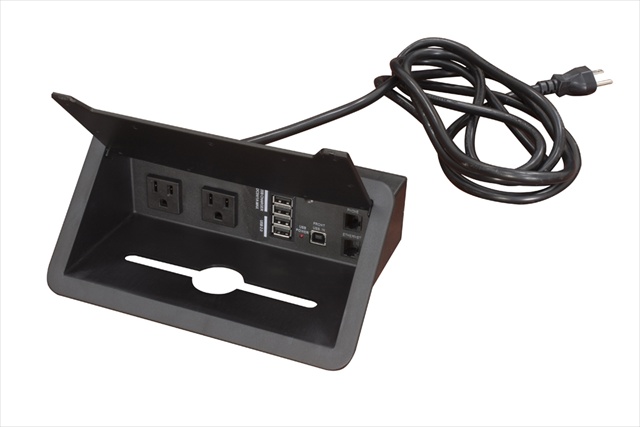 The Power & Data Port features 2 USB 2.0 ports 2 USB charging ports 2 AC 125V 60Hz power outlets 1 front/ rear Ethernet port 1 front/ rear USB port & 1 front/ rear phone port. Power block features a black cover plate for clean neat look and is angled toward user for convenience. It can be placed in desks training tables or conference table.