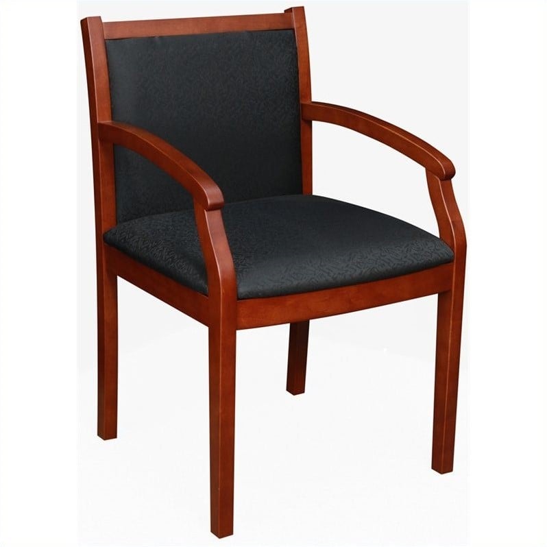 | Regency - Guest Chairs - 9875CHBK - Create a solid impression upon guests in the reception area with the regency Cherry wood and black fabric regent side chair. The wooden frame of this guest chair has a hand rubbed finish for perfect craftsmanship. The arms are slightly slanted to provide some comfort and style to this chair that has black vinyl upholstery on the seat and backrest.Constructed with a wood frame and upholstered seat and back, and has a hand rubbed finishFinished in Cherry WoodBlack FabricSpecifications:Overall Product Dimensions: 34.5 H x 22 W x 23 D