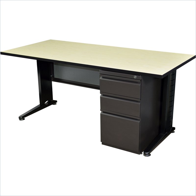 | Regency - Computer Desks - MSP6024PL - Fusion Desks bring a modern yet functional edge to any office or classroom. This 60-inch Single Pedestal Desk is good looking and has amazing interior wire management capabilities. Black metal C-Legs have a vented compartment with removable cover that runs the length of the leg. Wires run from a power source on the floor through the legs and cabling cutouts in the modesty panel and up to desktops for instant connectivity. It inlcudes one Box-Box-File Pedestal that can be installed on either side of the desk. The file drawer accepts both letter and legal filing while the box drawers keep supplies handy. All drawers lock and have silver colored curved drawer pulls. The desktop is constructed of a thermal fused melamine Maple laminate that is 1-inch thick and finished with a black T-Mold edge band. Rounded corners make the desk safer for everyone. Laminates are scratch, stain and burn resistant and wipe clean easily. The legs and modesty panel are constructed of a sturdy metal with a sylish black finish to match any decor. Fusion casegoods are backed by a 10-year limited manufacturer's warranty. Finish: MapleMaterial: Laminate/ MetalGood looking 60-inch Single Pedestal Desk with amazing interior wire management capabilitesC-Legs have a compartment with removable cover for wires to run from the floor through the legs and up to tabletopsBox-Box-File Pedestal with locking drawers can be installed on either side of the deskMaple thermal fused melamine laminate desktop is scratch, stain and burn resistantFinished with a black T-Mold edge bandingBacked by a 10-year limited manufacturer's warrantySpecifications:Overall Product Dimensions: 29 H x 60 W x 24 DProduct Weight: 130 lbs