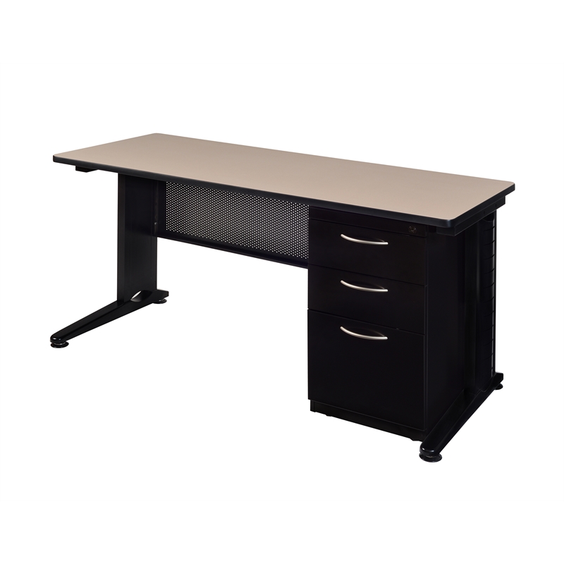 | Regency - Computer Desks - MSP6630BE - Fusion Desks bring a modern yet functional edge to any office or classroom. This 66-inch Single Pedestal Desk is good looking and has amazing interior wire management capabilities. Black metal C-Legs have a vented compartment with removable cover that runs the length of the leg. Wires run from a power source on the floor through the legs and cabling cutouts in the modesty panel and up to desktops for instant connectivity. It inlcudes one Box-Box-File Pedestal that can be installed on either side of the desk. The file drawer accepts both letter and legal filing while the box drawers keep supplies handy. All drawers lock and have silver colored curved drawer pulls. The 30-inch wide desktop is constructed of a thermal fused melamine Beige laminate that is 1-inch thick and finished with a black T-Mold edge band. Rounded corners make the desk safer for everyone. Laminates are scratch, stain and burn resistant and wipe clean easily. The legs and modesty panel are constructed of a sturdy metal with a sylish black finish to match any decor. Fusion casegoods are backed by a 10-year limited manufacturer's warranty. Finish: BeigeMaterial: Laminate/ MetalGood looking 66-inch long by 30-inch wide Single Pedestal Desk with amazing interior wire management capabilitesC-Legs have a compartment with removable cover for wires to run from the floor through the legs and up to tabletopsBox-Box-File Pedestal with locking drawers can be installed on either side of the deskBeige thermal fused melamine laminate desktop is scratch, stain and burn resistantFinished with a black T-Mold edge bandingBacked by a 10-year limited manufacturer's warrantySpecifications:Overall Product Dimensions: 29 H x 66 W x 30 DProduct Weight: 150 lbs