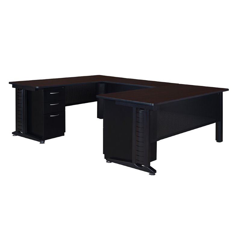 | Regency - Computer Desks - MUD723042MW - Fusion Desks bring a modern yet functional edge to any office or classroom. This 72-inch Double Pedestal U-Desk with 42-inch bridge is good looking and has amazing interior wire management capabilities. Black metal C-Legs have a vented compartment with removable cover that runs the length of the leg. Wires run from a power source on the floor through the legs and cabling cutouts in the modesty panel and up to desktops for instant connectivity. It inlcudes one Box-Box-File Pedestal and one File-File Pedestal that can be installed on either side of the desk. The file drawers accept both letter and legal filing while the box drawers keep supplies handy. All drawers lock and have silver colored curved drawer pulls. The interior of the desk is spacious, allowing plenty of room to move between surfaces. The desktop is constructed of a thermal fused melamine Mocha Walnut laminate that is 1-inch thick and finished with a black T-Mold edge band. Rounded corners make the desk safer for everyone. Laminates are scratch, stain and burn resistant and wipe clean easily. The legs and modesty panel are constructed of a sturdy metal with a sylish black finish to match any decor. Fusion casegoods are backed by a 10-year limited manufacturer's warranty. Finish: Mocha WalnutMaterial: Laminate/ MetalGood looking 72-inch Double Pedestal U-Desk with 42-inch return with amazing interior wire management capabilitesC-Legs have a compartment with removable cover for wires to run from the floor through the legs and up to tabletopsBox-Box-File Pedestal and File-File Pedestal with locking drawers can be installed on either side of the deskMocha Walnut thermal fused melamine laminate desktop is scratch, stain and burn resistantFinished with a black T-Mold edge bandingBacked by a 10-year limited manufacturer's warrantySpecifications:Overall Product Dimensions: 29 H x 72 W x 96 DProduct Weight: 330 lbs