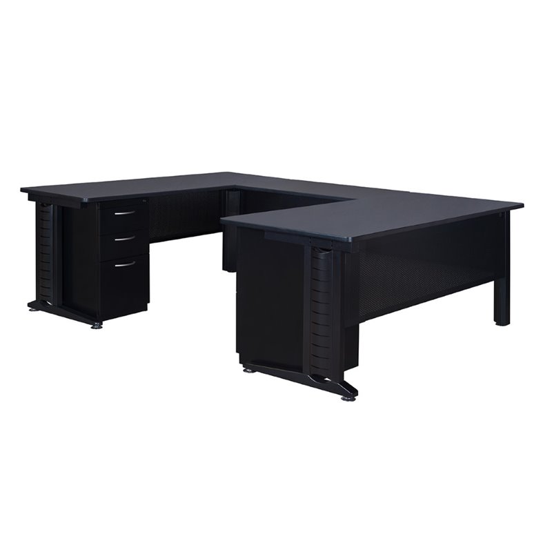 | Regency - Computer Desks - MUD723048GY - Fusion Desks bring a modern yet functional edge to any office or classroom. This 72-inch Double Pedestal U-Desk with 48-inch bridge is good looking and has amazing interior wire management capabilities. Black metal C-Legs have a vented compartment with removable cover that runs the length of the leg. Wires run from a power source on the floor through the legs and cabling cutouts in the modesty panel and up to desktops for instant connectivity. It inlcudes one Box-Box-File Pedestal and one File-File Pedestal that can be installed on either side of the desk. The file drawers accept both letter and legal filing while the box drawers keep supplies handy. All drawers lock and have silver colored curved drawer pulls. The interior of the desk is spacious, allowing plenty of room to move between surfaces. The desktop is constructed of a thermal fused melamine Gray laminate that is 1-inch thick and finished with a black T-Mold edge band. Rounded corners make the desk safer for everyone. Laminates are scratch, stain and burn resistant and wipe clean easily. The legs and modesty panel are constructed of a sturdy metal with a sylish black finish to match any decor. Fusion casegoods are backed by a 10-year limited manufacturer's warranty. Finish: GrayMaterial: Laminate/ MetalGood looking 72-inch Double Pedestal U-Desk with 48-inch return with amazing interior wire management capabilitesC-Legs have a compartment with removable cover for wires to run from the floor through the legs and up to tabletopsBox-Box-File Pedestal and File-File Pedestal with locking drawers can be installed on either side of the deskGray thermal fused melamine laminate desktop is scratch, stain and burn resistantFinished with a black T-Mold edge bandingBacked by a 10-year limited manufacturer's warrantySpecifications:Overall Product Dimensions: 29 H x 72 W x 102 DProduct Weight: 338 lbs