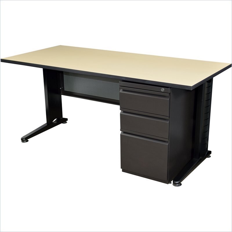 | Regency - Computer Desks - MSP7230BE - Fusion Desks bring a modern yet functional edge to any office or classroom. This 72-inch Single Pedestal Desk is good looking and has amazing interior wire management capabilities. Black metal C-Legs have a vented compartment with removable cover that runs the length of the leg. Wires run from a power source on the floor through the legs and cabling cutouts in the modesty panel and up to desktops for instant connectivity. It inlcudes one Box-Box-File Pedestal that can be installed on either side of the desk. The file drawer accepts both letter and legal filing while the box drawers keep supplies handy. All drawers lock and have silver colored curved drawer pulls. The 30-inch wide desktop is constructed of a thermal fused melamine Beige laminate that is 1-inch thick and finished with a black T-Mold edge band. Rounded corners make the desk safer for everyone. Laminates are scratch, stain and burn resistant and wipe clean easily. The legs and modesty panel are constructed of a sturdy metal with a sylish black finish to match any decor. Fusion casegoods are backed by a 10-year limited manufacturer's warranty. Finish: BeigeMaterial: Laminate/ MetalGood looking 72-inch long by 30-inch wide Single Pedestal Desk with amazing interior wire management capabilitesC-Legs have a compartment with removable cover for wires to run from the floor through the legs and up to tabletopsBox-Box-File Pedestal with locking drawers can be installed on either side of the deskBeige thermal fused melamine laminate desktop is scratch, stain and burn resistantFinished with a black T-Mold edge bandingBacked by a 10-year limited manufacturer's warrantySpecifications:Overall Product Dimensions: 29 H x 72 W x 30 DProduct Weight: 160 lbs