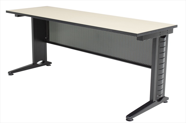 The thick laminate work surface protects against abrasions and stains of all kinds. The legs are C shaped legs with amazing interior wire managing capabilities and they are stabilized by a perforated metal modesty that also has wire management port holes. Wire management trough not included. Features