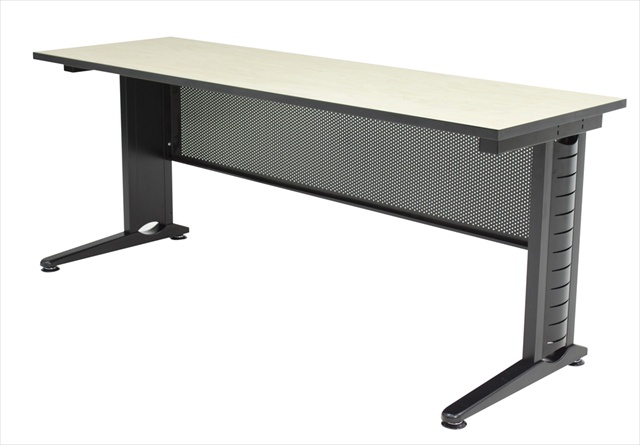 The thick laminate work surface protects against abrasions and stains of all kinds. The legs are C shaped legs with amazing interior wire managing capabilities and they are stabilized by a perforated metal modesty that also has wire management port holes. Wire management trough not included. Features