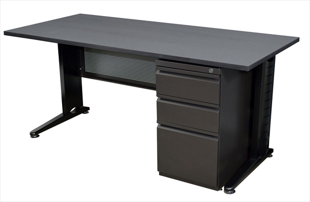 The thick laminate work surface protects against abrasions and stains of all kinds. The legs are C shaped legs with amazing interior wire managing capabilities and they are stabilized by a perforated metal modesty that also has wire management port holes. The file drawers have fully extendable ball bearing suspension with a 150lb weight capacity. Features