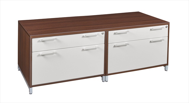 Thermal Fused Melamine Laminate with a Commercial grade 3 mm. edge band. Features leveling glides & Full suspension locking drawers come equipped with 6 in. polished metal bar pulls & white drawer interiors. Features