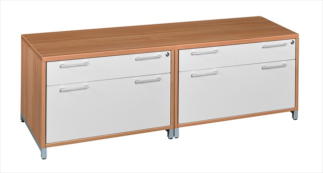 Thermal Fused Melamine Laminate with a Commercial grade 3 mm. edge band. Features leveling glides & Full suspension locking drawers come equipped with 6 in. polished metal bar pulls & white drawer interiors. Features