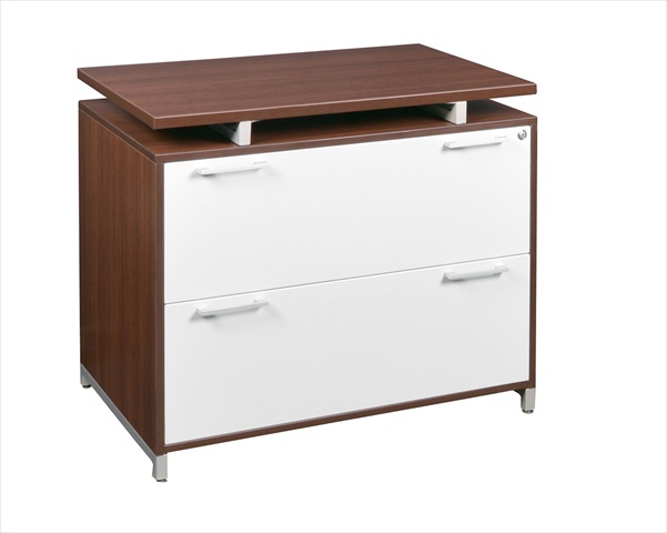 Thermal Fused Melamine Laminate with a Commercial grade 3 mm. edge band. Full suspension locking drawers come equipped with 6 in. polished metal bar pulls & white drawer interiors. Includes leveling glides and floating top. Features